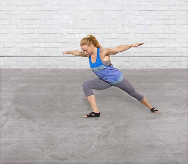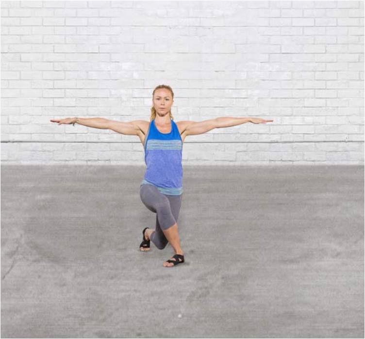 Patada frontal a zancada hacia atrás. Empezamos con los brazos estirados en cruz y un pie ligeramente retrasado. Entonces levantamos frontalmente la pierna estirada y al bajarla la llevamos hacia atrás del todo para hacer una especie de lunge. Repetimos el movimiento durante un minuto y lo hacemos otro minuto con la otra pierna.