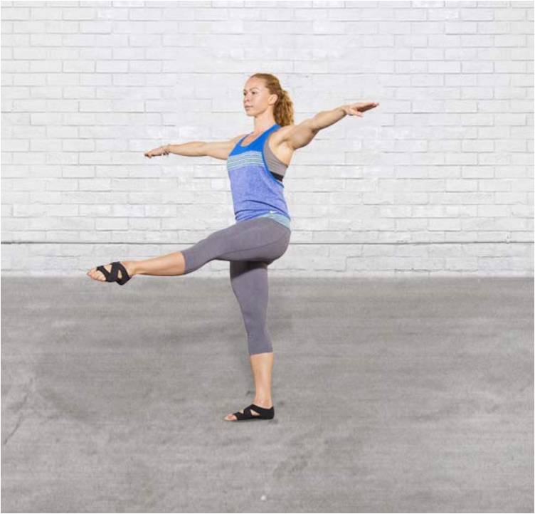 Combinación de sentadilla en plié con estiramiento sobre puntera. Desde la segunda posición, extendemos el brazo hasta ponerlo paralelo al suelo. Nos ponemos de puntillas y con los talones despegados del suelo flexionamos las rodillas para hacer una sentadilla de sumo en plié. Entonces, bajamos los talones al suelo y estiramos las piernas hasta volver a la posición inicial. Repetimos el movimiento durante un minuto.
