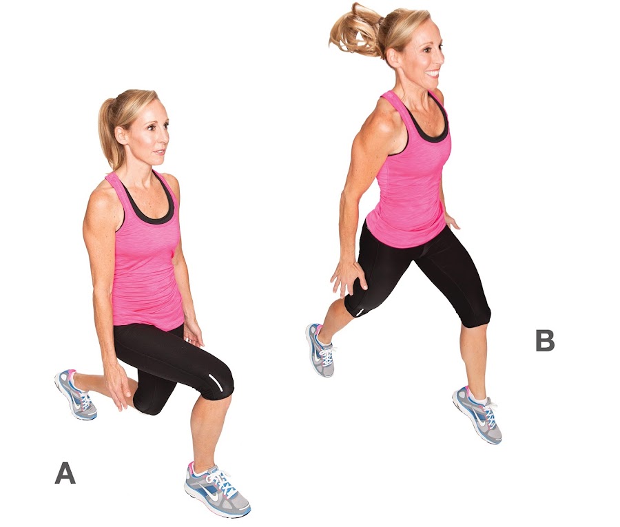 Split jumps. Se trata de pasar de una posición de lunge a otra con un salto. Podemos hacer 25 repeticiones.