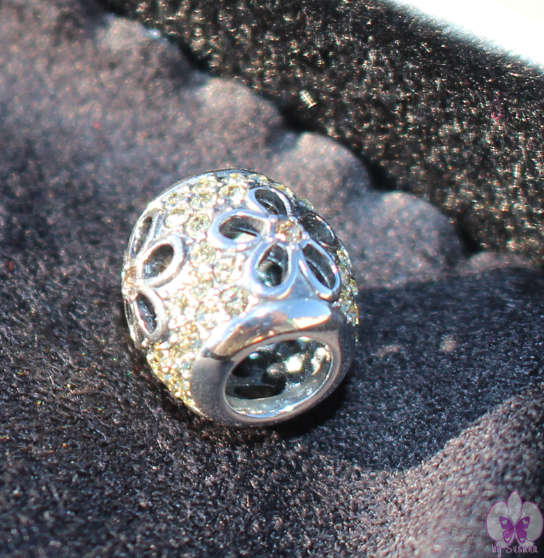 La primera que escogí es de flores, tipo margaritas, una flor que me gusta mucho y en general, este charm representa lo mucho que me gustan las flores, afición que cada vez es mayor y todo por "culpa" o "gracias a" mi madre, una gran amante de las plantas y las flores y que tiene una mano buenísima para ello, por lo que agradezco sus consejos a la hora de cuidarlas, si no, sería un desastre. Mi flor favorita como ya os he dicho en varias ocasiones, es la orquídea, pero como no vi ninguna de esta flor, cogí esta tan mona con los brillantes amarillos.