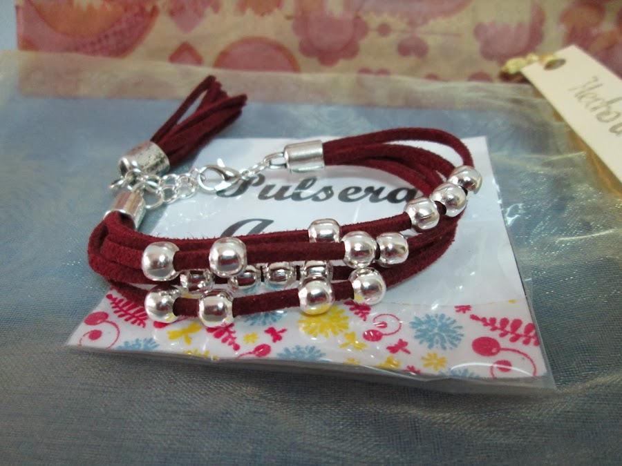 La siguiente pulsera, también me ha encantado. Y en color granate, queda preciosa. Además, las bolitas plateadas se mueven y son como cascabeles, jejeje. ¡¡Me encanta el pompón que tiene y como queda puesta en la muñeca!!.