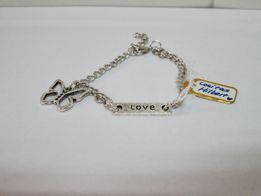 La siguiente, es una pulsera de cadena con una plaquita que pone grabado la palabra "love", y que también tiene un charm de mariposa, sin duda, ¡¡es preciosa!!. Esta pulsera se trata del último modelo que han creado.