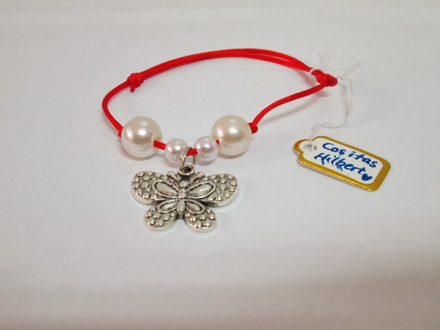 La primera es una pulsera ajustable con cordón rojo y perlas. Tiene una mariposa en medio. La verdad es que es preciosa, ¡¡me encanta!!. Además, se trata del primer diseño que realizaron.