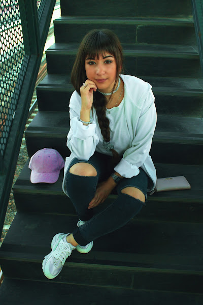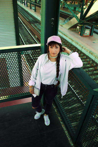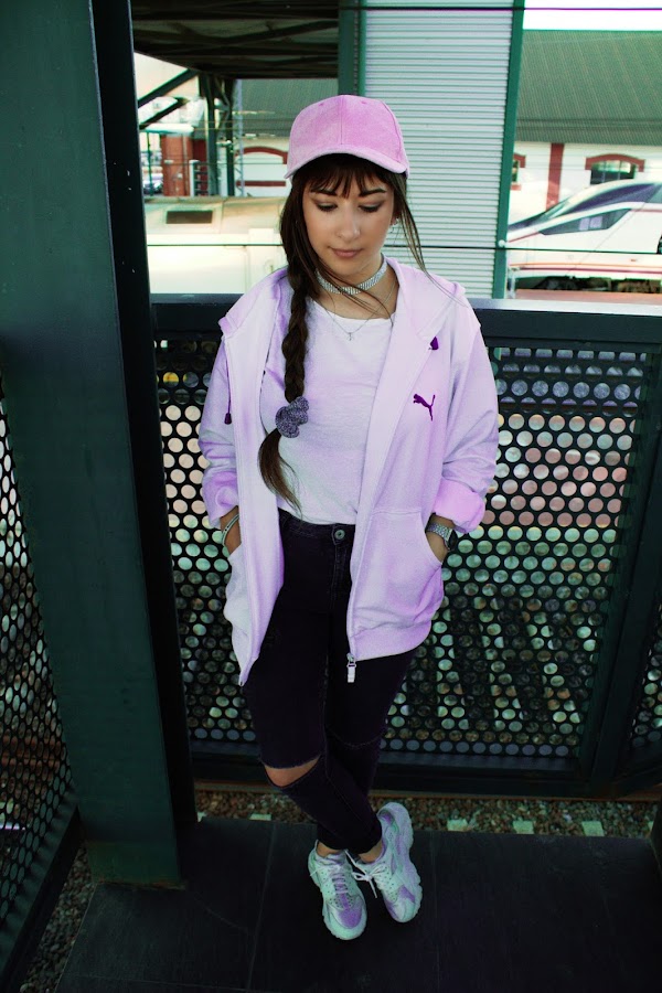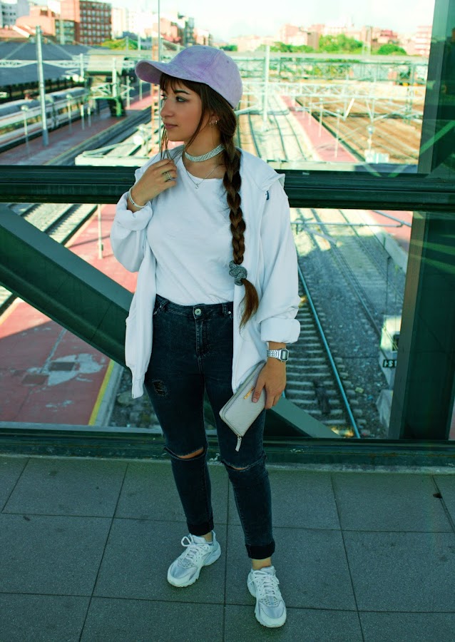 El look lo componen una chaqueta Vintage de Puma, una camiseta básica blanca, unos vaqueros rotos y de tiro alto, y por supuesto mis queridas aunque ya un poco desgastadas Nike Huarache. Nunca falta algún accesorio para completar, como mi choker de piedras, coletero, reloj y anillo en plata. Y por último gorra y cartera lila, para dar un toque de color. Espero que guste, hasta el próximo. (Detalles de las prendas abajo)
