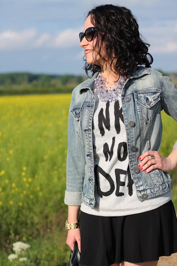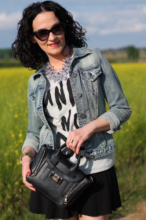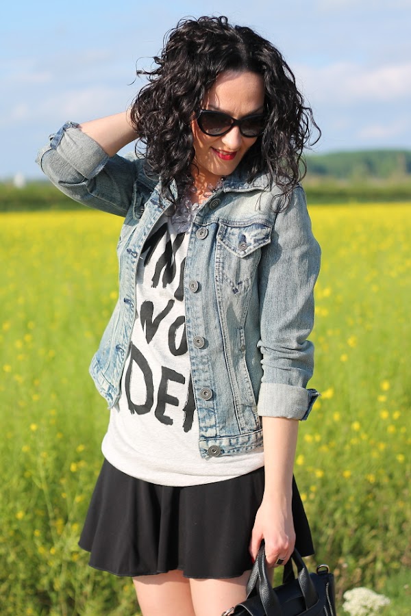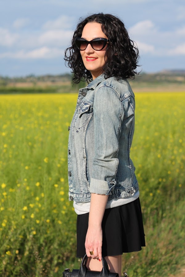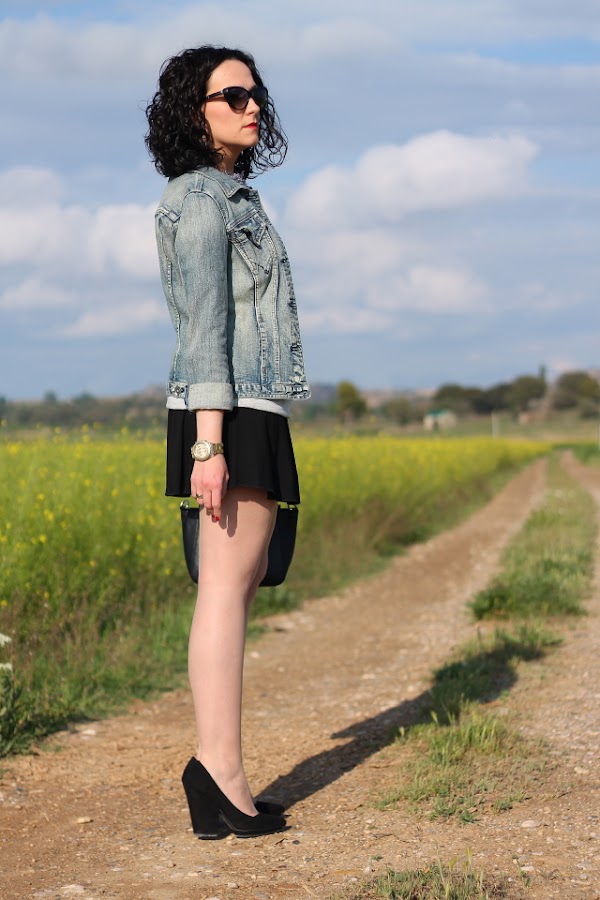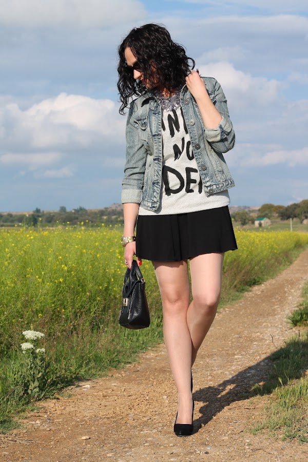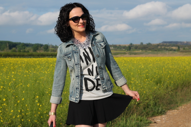 Cazadora: Only. Camiseta: Zara Hombre. Falda: Mango.
