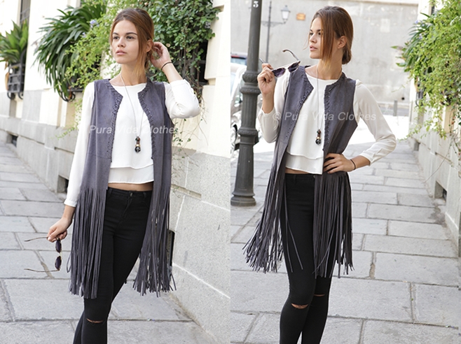 Tops, blusas, bodys, monos, vestidos, tendencia flecos, chaquetas, accesorios y complementos como las gafas son las prendas que componen su colección.