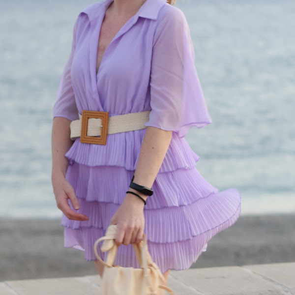 El color lila claro, los volantes y plisados, el tejido fresquito...Para llevar con o sin cinturón, me parece una prenda muy versátil.