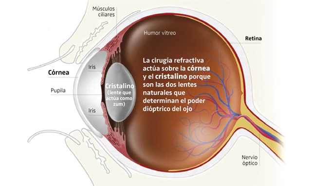 Es decir, el ojo, órgano encargado de la visión, realiza una función similar a la de una cámara fotográfica. Dispone de unas lentes encargadas de formar una imagen nítida del mundo exterior (cristalino y córnea), sobre una película sensible (retina) que recibe esta imagen y, a través del nervio óptico, la envía a nuestro cerebro para que la "veamos". Para que esta imagen se vea nítida deberá estar enfocada exactamente sobre la retina. Si esto no ocurre, podemos estar ante un defecto refractivo.