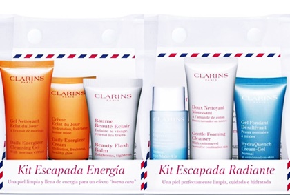 Muestras de cremas y desmaquillante. Esas muestras que te regalaron hace tiempo y están sin abrir, te van a venir fenomenal para no tener que llevar tus cremas tamaño normal. Si te has quedado sin ellas, en Primor puedes hacerte con éstos kits de Clarins por sólo 5,99 euros cada uno. El Kit de Escapada Energía lleva crema hidratante, gel limpiador y bálsamo de belleza relámpago. El Kit de Escapada Radiante lleva desmaquillante de ojos, limpiador espumoso y gel hidratante.