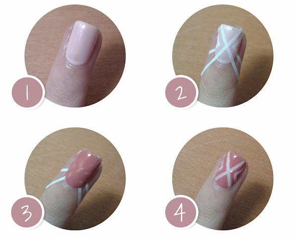 Colocamos las nailtapes tal y como veis en la imagen. Necesitaremos 6 tiras, dos más alargadas para la cruz central, y cuatro más cortitas para los triángulos de las esquinas. Ya sabéis: retirar en sentido inverso al que pusisteis.