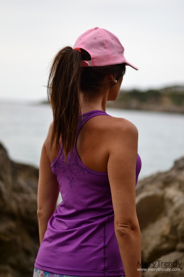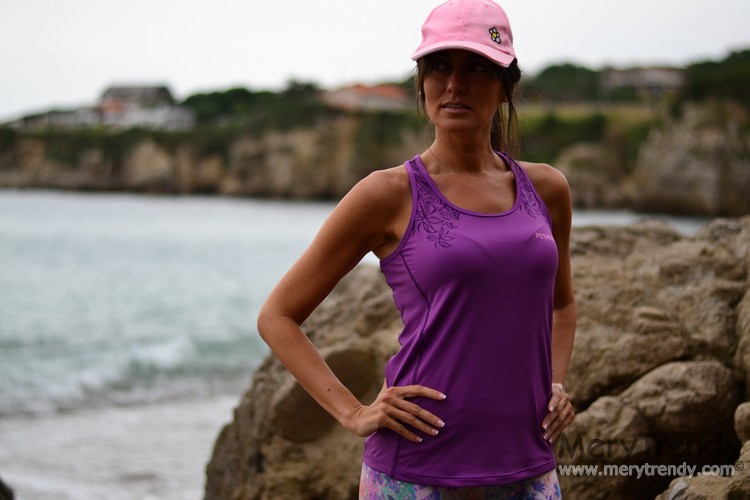 Es un conjunto formado, de un lado, por una camiseta de tirantes de espalda de nadadora de la marca española (y además asturiana) Petalys, que precisamente os enseñaba a finales de mayo, pero en color azul, aquí. Una prenda técnica para running, muy fresquita, que me permite disfrutar más de mis entrenamientos gracias a su tejido ligero mezcla de Coolmax y Lycra y sus costuras mínimas, que me evitan incómodas y molestas rozaduras. Por otra parte, dispone de filtro UV para protegerme de los efectos solares más nocivos. Además, y gracias a su corte semi-entallado, se adapta a mi figura cómodamente y de manera natural, permitiéndome a la vez total libertad de movimientos. Por si esto fuera poco, con la técnica de sublimación de su estampado, me he asegurado una conservación óptima de todas sus propiedades por mucho tiempo: transpirabilidad, suavidad y color invariable.