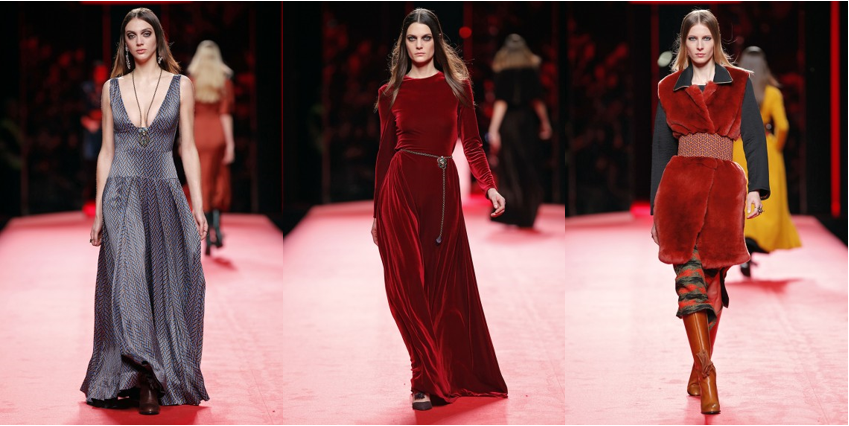 Sus ya icónicos vestidos tienen en esta ocasión una estética renovada: menos minimal y más gipsy, en una combinación de túnicas de encaje, vestidos midi con amplios escotes y pantalones de talle alto. En los materiales se dan cita organzas satinadas, terciopelos y hasta peletería, con un material muy similar a la calidad de la chinchilla. Los prints rusos se mezclan con telas aztecas, los tejidos japoneses se contraponen a los colores chinos. Las siluetas de los años 40 y 70 juegan con diferentes volúmenes para dibujar a una mujer europea con un toque oriental.
