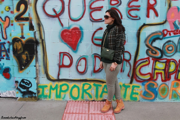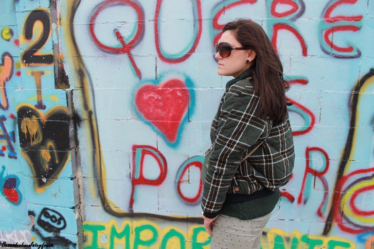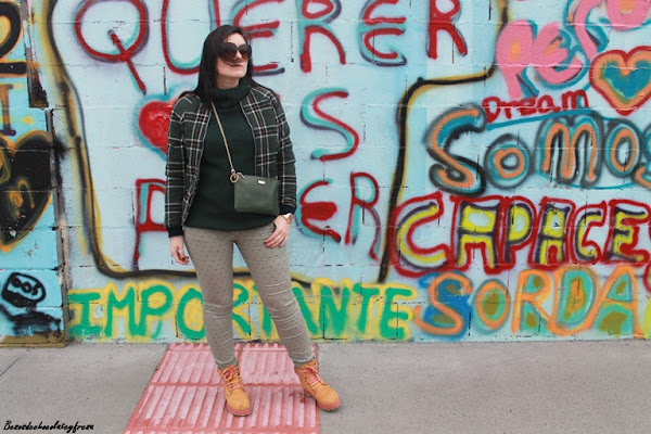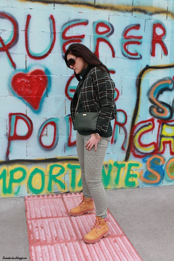 Llevo sweater verde botella de punto con cuello vuelto, jeans verdes de topos, bomber tartan con detalles en nude al igual que las botas ideales para estos días de lluvia que estamos teniendo y clutch también del mismo color. El poder del verde jeje