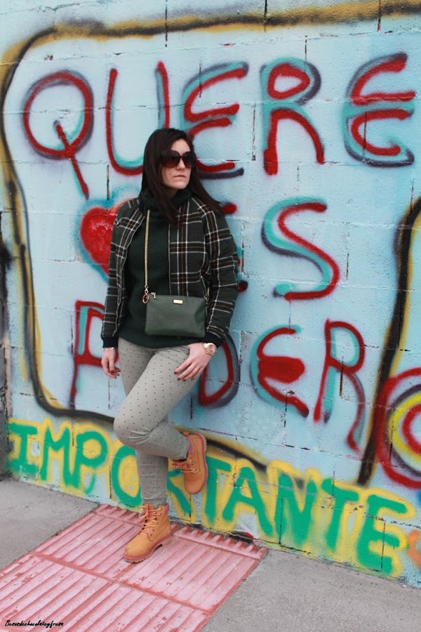 Bottle wear green sweater knit turtleneck, green polka dot jeans, bomber tartan details in nude like the ideal boots these days of rain were having and clutch also the same color. The power of green hehe