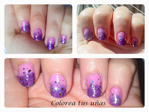 Como podéis ver, usé despues un glitter de Essence y la verdad es que con el glitter me gusta muchísimo más el resultado de la manicura, pero ya véis que en el degradado no tengo aún el aprobado.