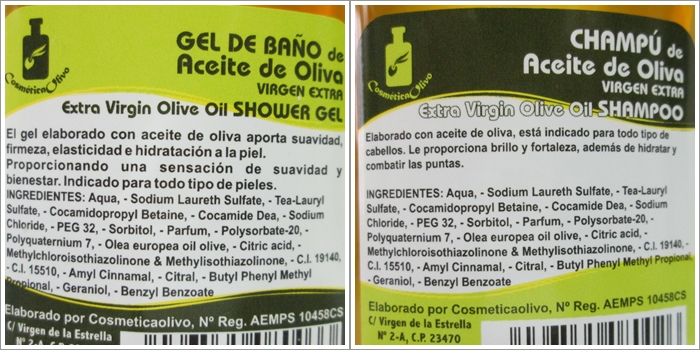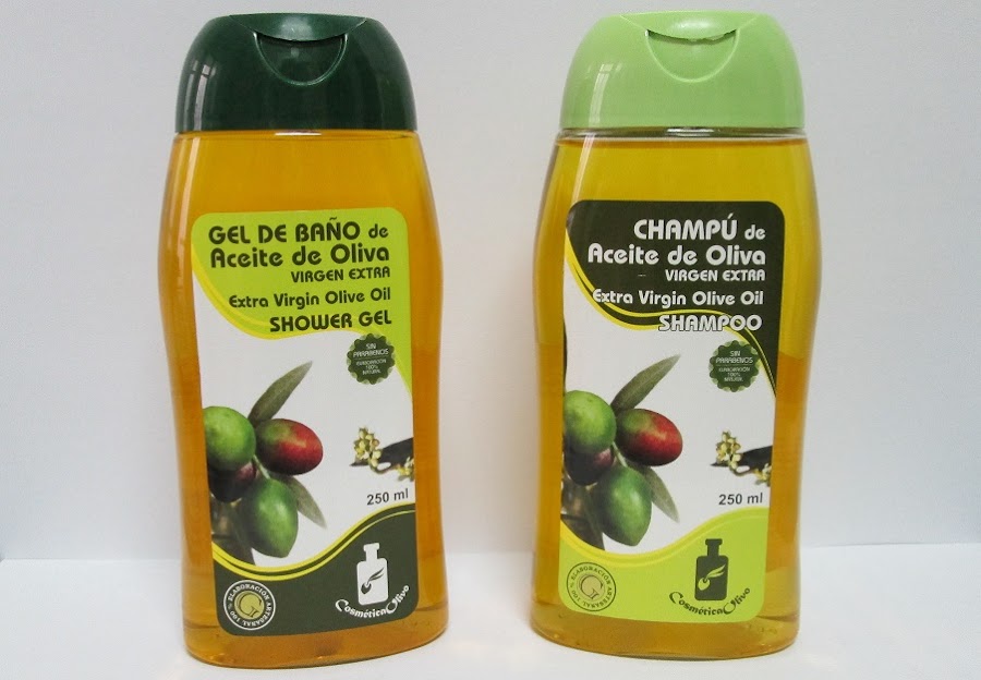 Tanto el gel de ducha como el champú, se presentan en unos envases muy bonitos, de plástico transparente, y que contienen 250 ml de cantidad, cada uno. Ambos, tienen una textura gel (muy similiar a la glicerina) muy agradable, y de color miel. Lo primero que destaco de estos dos primeros productos, es que tienen un olor muy familiar, pero para nada huelen a oliva artificial (como ocurre en muchos productos convencionales). Éstos huelen exactamente igual al aroma que tienen las plantas del olivo.