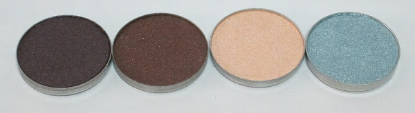 Los tonos que yo tengo, de izda a dcha son: 229 (un morado oscuro con un subtono negro, con destellos rosas), 302 (marrón chocolate, con destellos dorados), 300 (beig clarito, con destellos rosas) y 169 (verde turquesa, con muchos destellos plateados).