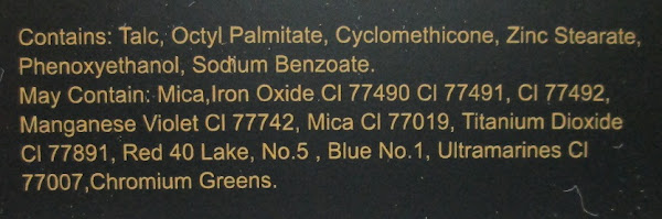 En esta foto, podéis apreciar los ingredientes que compone cada una de las sombras de esta marca. Si os fijáis, son sombras de ojos ricas en vitaminas C y E, que no contienen nada de aceite mineral, sulfatos, gluten, ni parabenos. Es asi, que ellas son hipoalergénicas, dermatológicamente testadas, no comedogénicas y cruelty-free. Por ello, son perfectas para ojos sensibles.