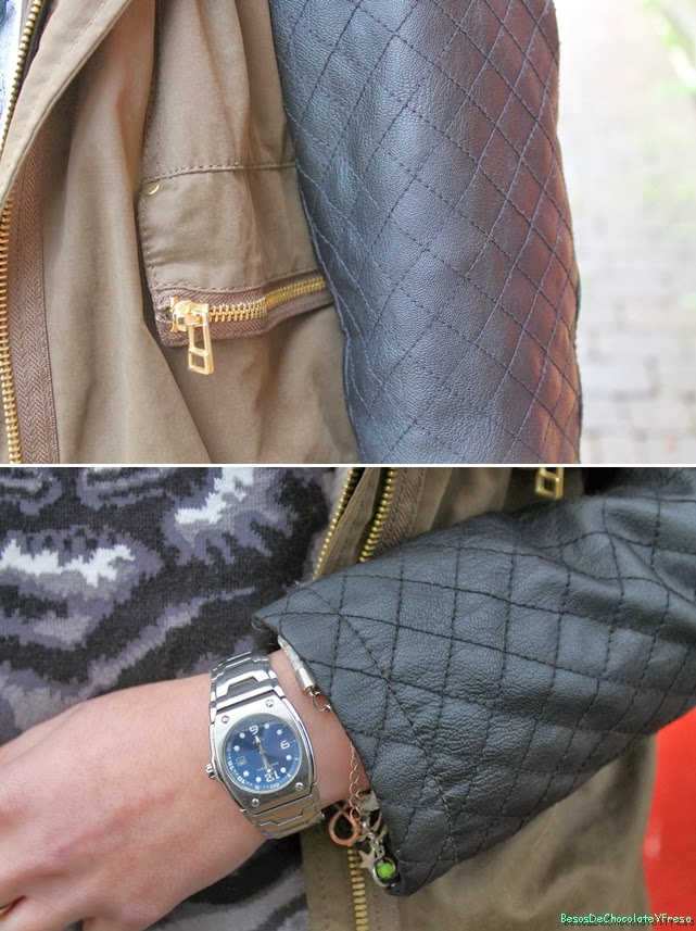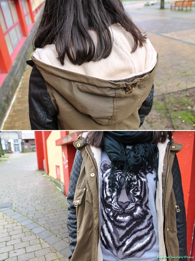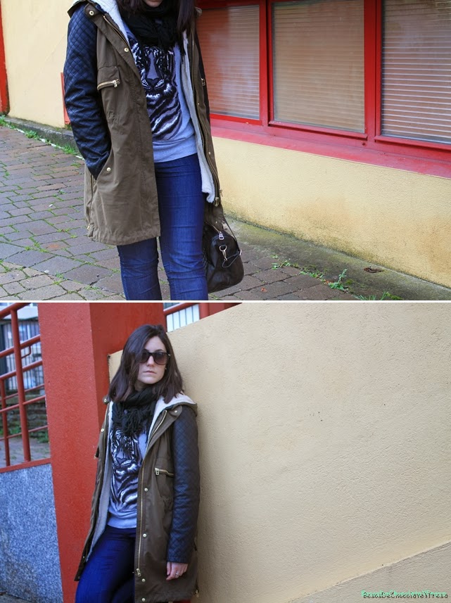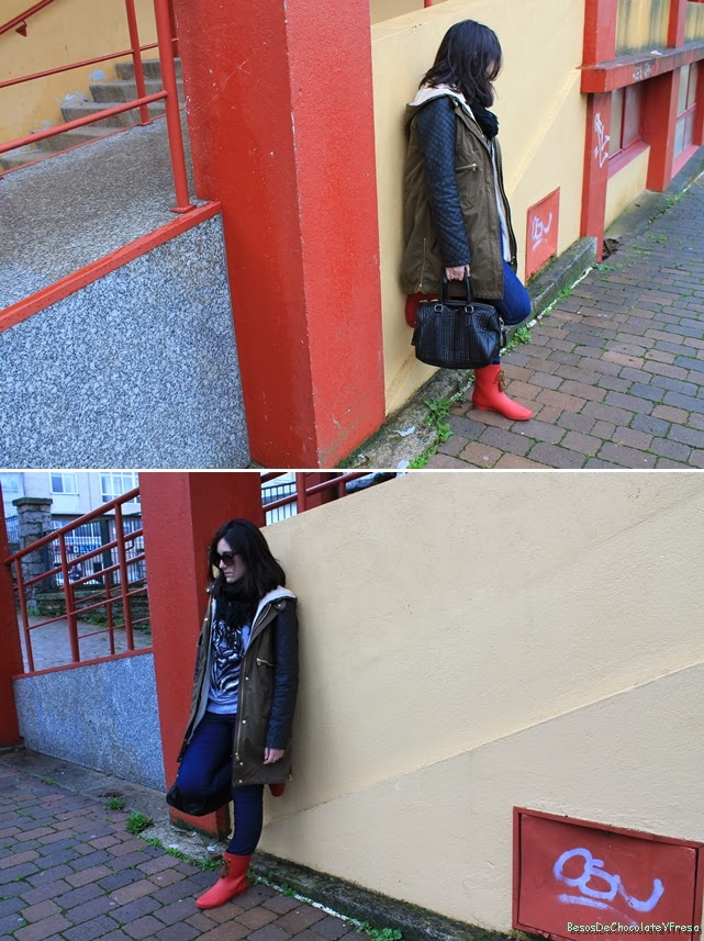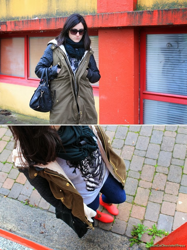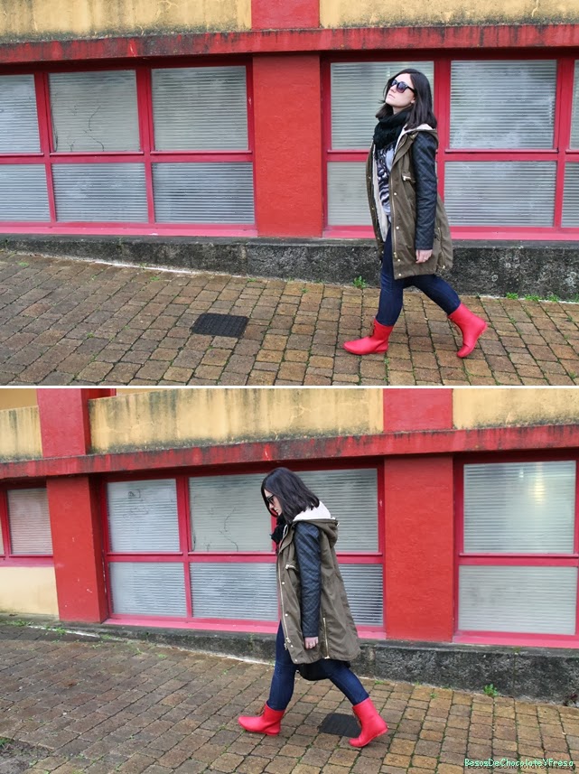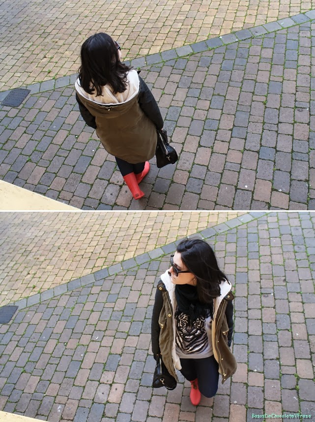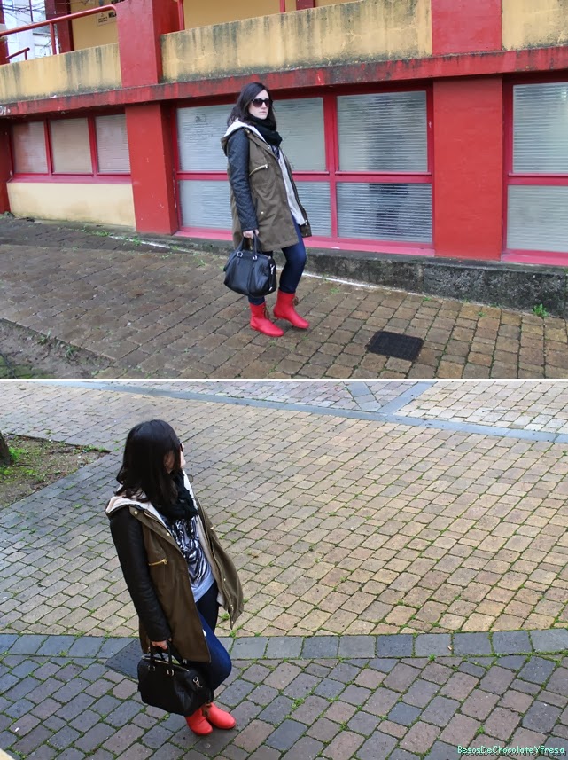 Para esta ocasión llevo parka verde militar con mangas polipiel combinada con sweater gris y estampado animal, jeans y botas de agua en rojo. Como complementos bolso tote en negro y foulard del mismo tono.
