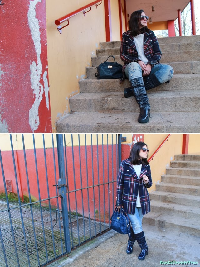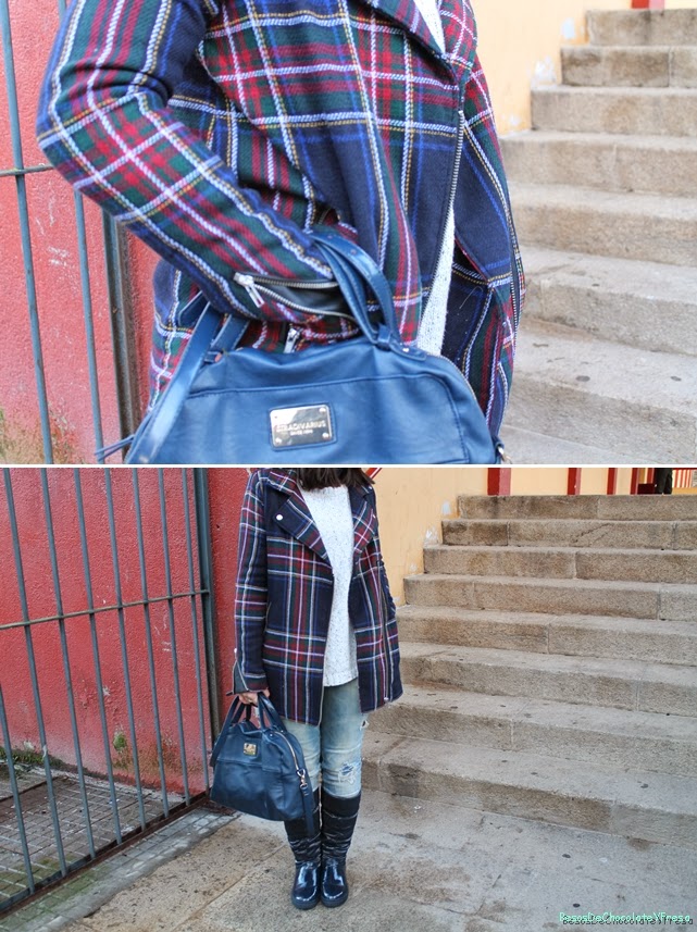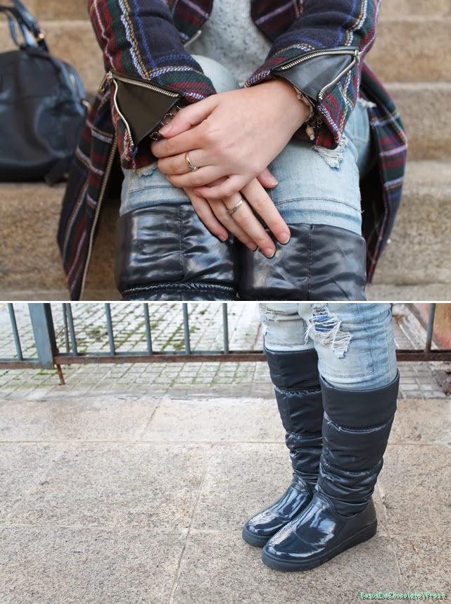 Son días de mucha lluvia y de temporal tras temporal, por eso que mejor ocasión que enfundarme mis botas de agua acolchadas de color azul. Cree un outfit similar al de hacer un par de días combinando ripped jeans con sweater jaspeado y añadiendo un sweater básico azul de cuello alto, para combatir el frío, abrigo tartan y bolso bandolera en azul.