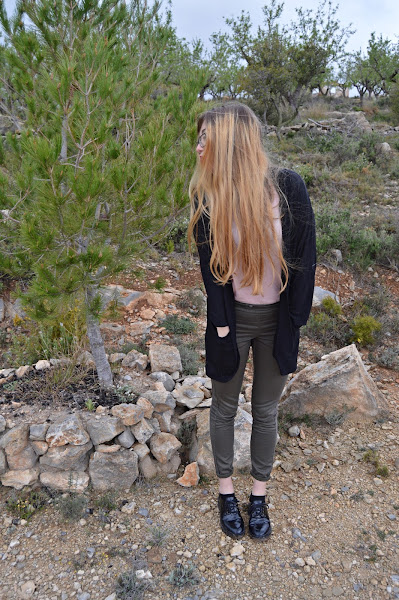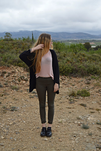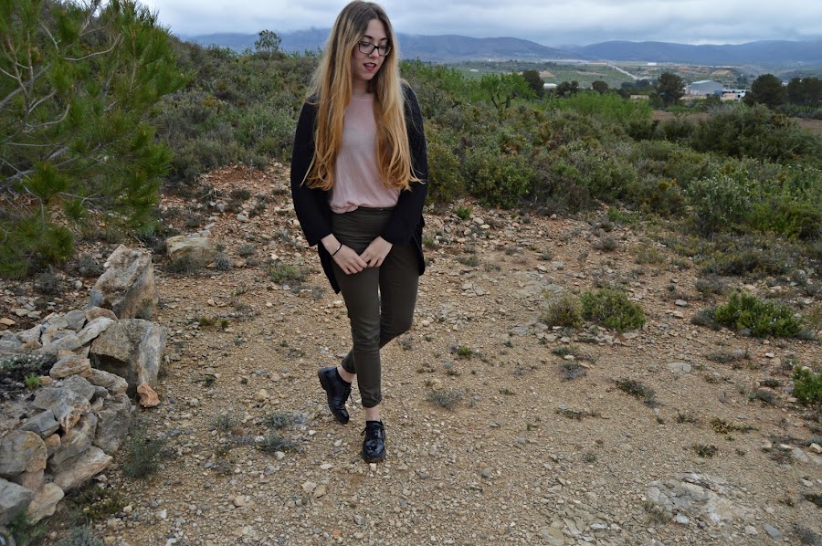 El outfit en este caso se compone por unos pantalones verde militar, una camiseta semitransparente rosa palo, los zapatos estilo blucher y (como no) un cárdigan finito, Creo que esta última prenda es fundamental para las épocas de entretiempo que no sabemos que ponernos, así que puede ser una perfecta inversión, al menos en mi caso lo es.