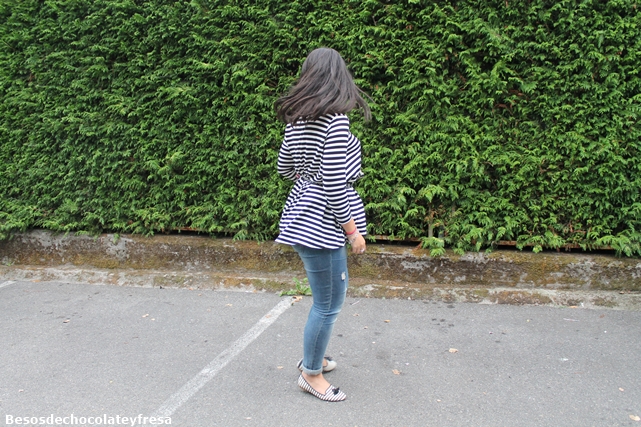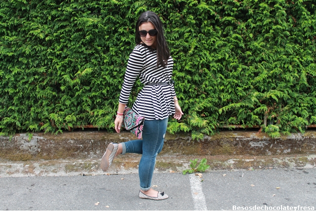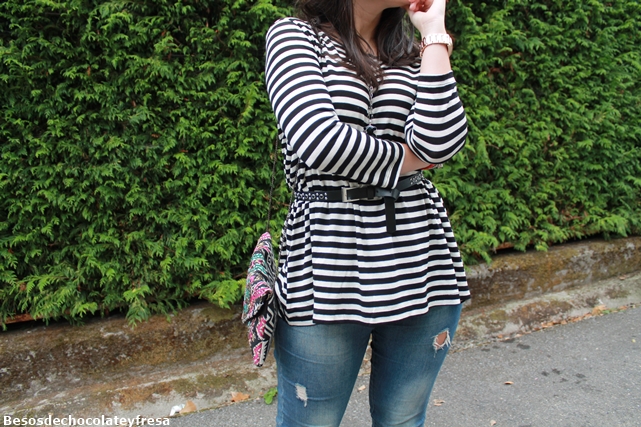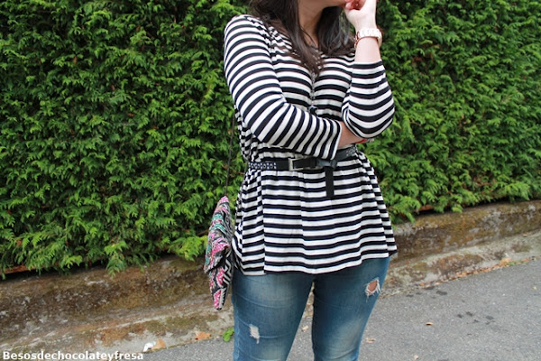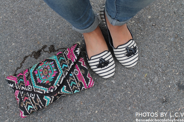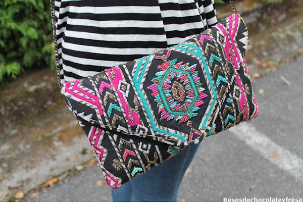Today I propose a total look striped black tones of color where ethnic clutch gives brightly like fuchsia pink and mint green colors.