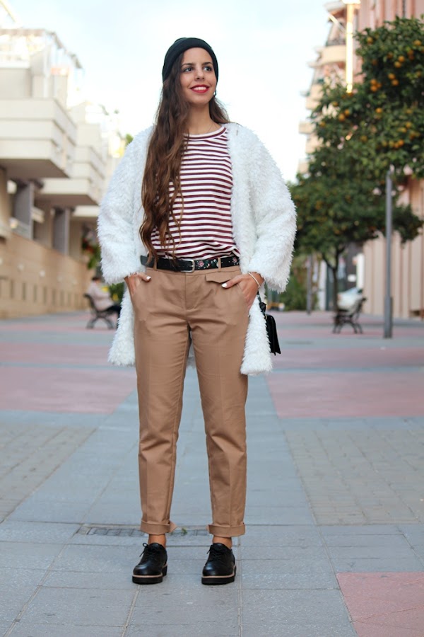 En el outfit de hoy llevo camiseta con rayas en tono burdeos de Gamiss. Es 100% Algodón. Me cogí la S y va genial para quien use 34-38 porque es amplia. La combiné con unos pantalones de pinzas de Mango. El cinturón es de Stradivarius que estaréis cansadas de verlo en muchos looks pero esque el bordado de flores me encanta