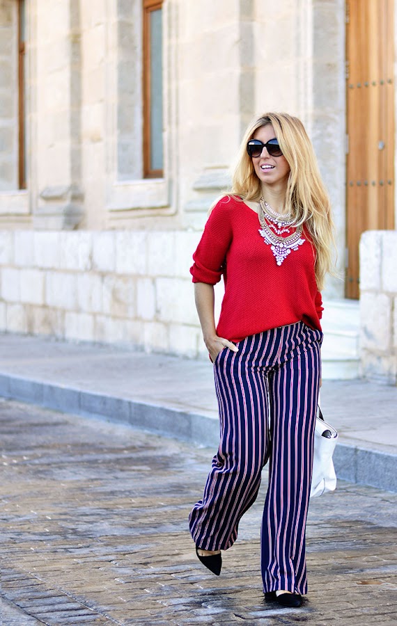 El día que compré estos pantalones de rayas la verdad es que no lo hice muy convencida. El corte que tienen no es de mis predilectos, pero una me iba y otra me venía, además, estaba con mi madre y ella me aconsejó que me los comprara porque seguro que los iba a llevar. Menos mal que le hice caso, me los estoy poniendo hasta la saciedad, es más parecen mi uniforme de trabajo porque voy tan cómoda y ...