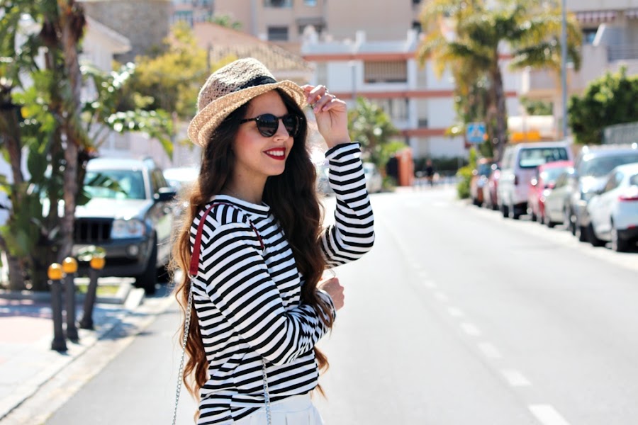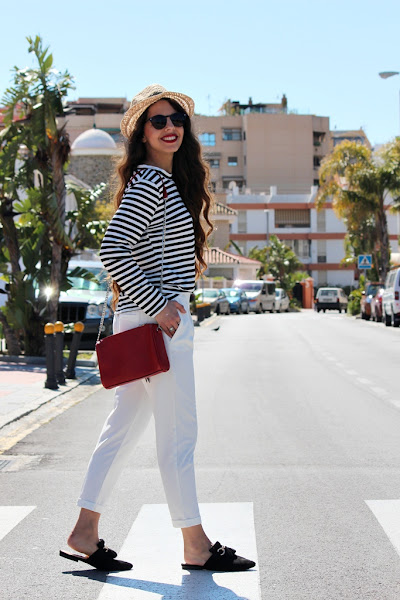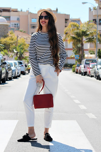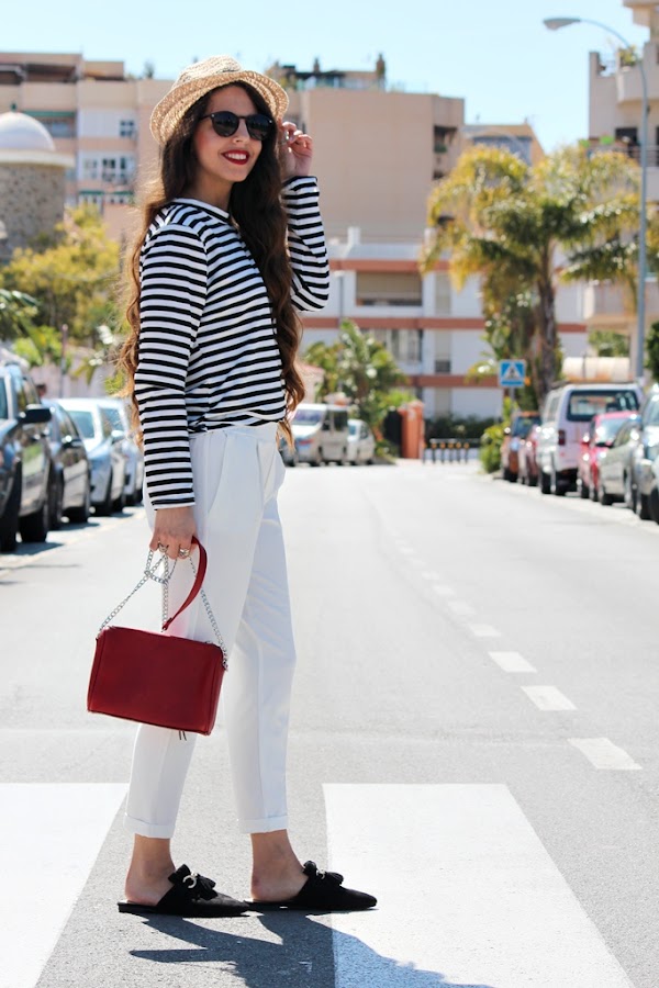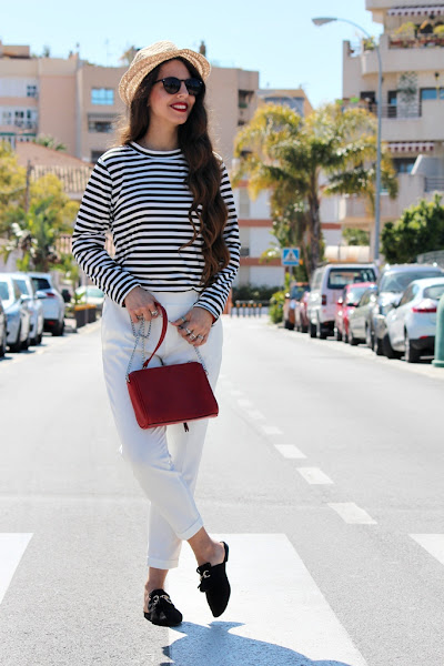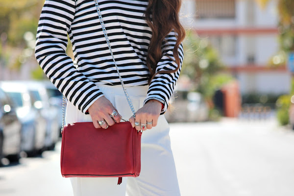 Hola cositas bonitas!! ¿Listas para una nueva semana? El outfit que os enseño me encanta. Llevo unos pantalones blancos de Bershka. Me los pongo muchísimo porque combinan genial con cualquier look, de hecho Aqui y Aqui podréis ver más outfits perfectos para esta temporada. La camiseta finita en color rojo es de Gamiss. Me gusta el detalle de la banda en medio, le da un toque diferente y estaba des ...