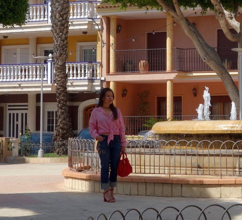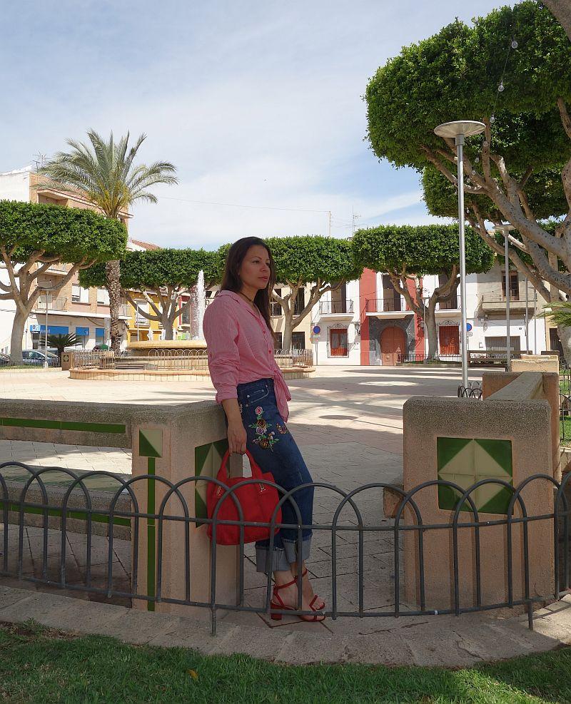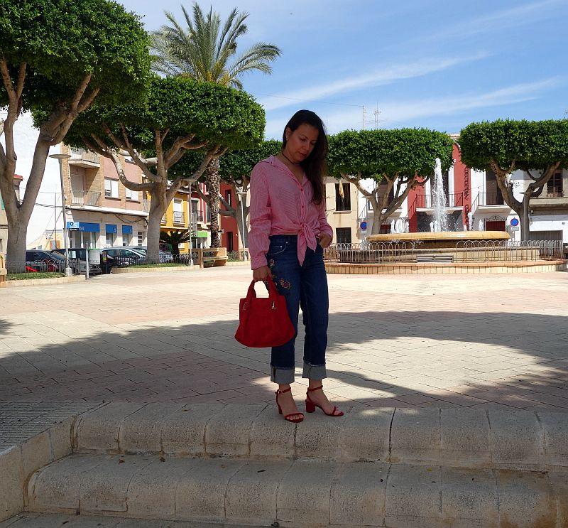 Ya en otro post anterior mostré un look también con bordados aquí y es que ya desde el invierno viene esta tendenciala, la cual en la primavera seguirá reinando. Las rayas sobre todo en azul con blanco vienen pisando fuerte, yo quise combinarla con esta blusa old de rayas rojas para resaltar el bordado de las flores y así poder combinarlas por fin con los zapatos rojos que tenía guardados por el frío y el bolso del mismo color; quise hacerle el nudo a la blusa porque como saben también viene los nudos, lazos tanto adelante como atrás, así que las que quieran mostrar cintura y puedan…aprovechar, que es la temporada para ello; las que no puedan, no hay problema porque también está la opción de los lazos en la espalda (y creo que el escote trasero es más sexy que el delantero), así que todas podemos ser sexys .
