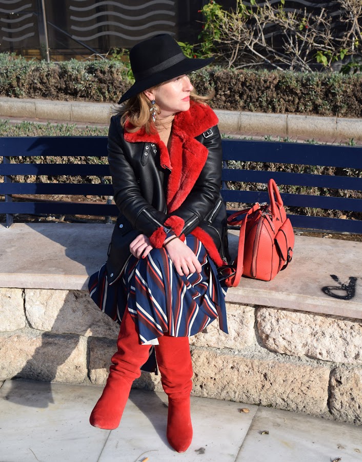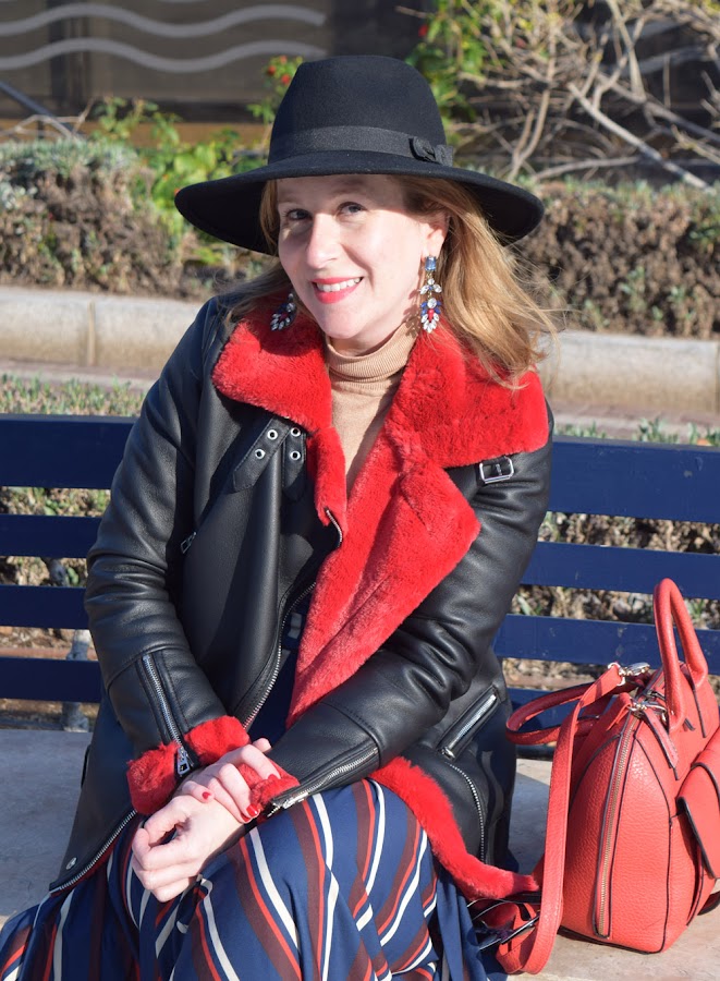 Para rematar el look, una biker con pelo rojo, muy abrigada, y que te permite llevar este tipo de prendas incluso con frío.