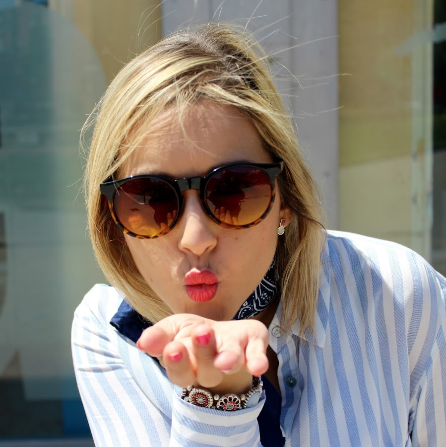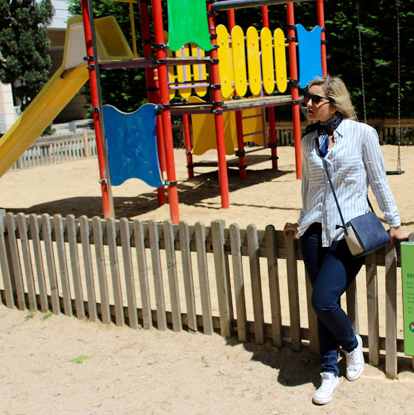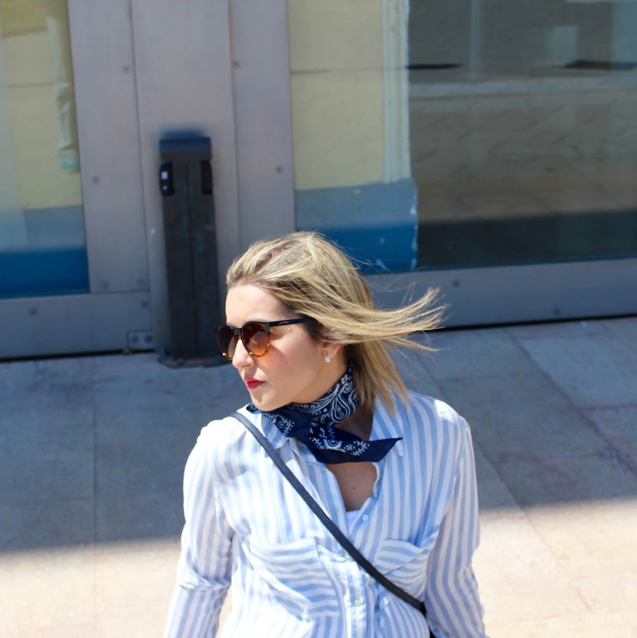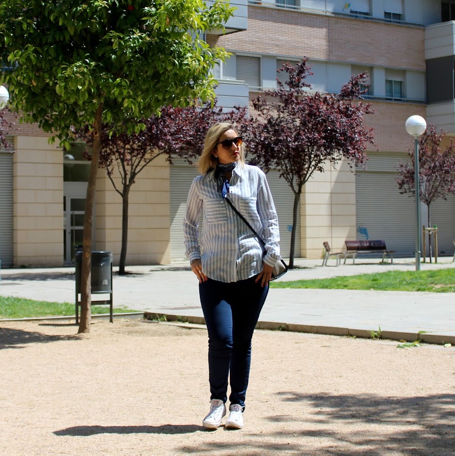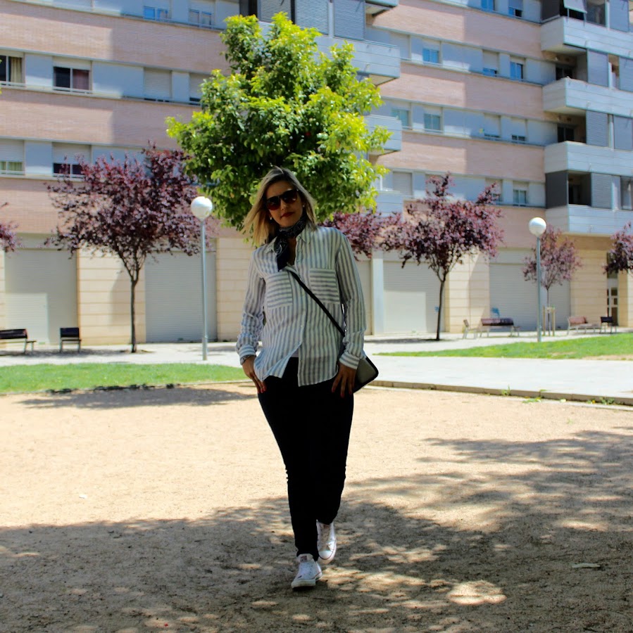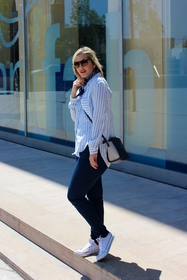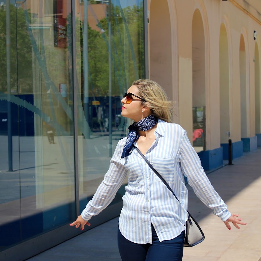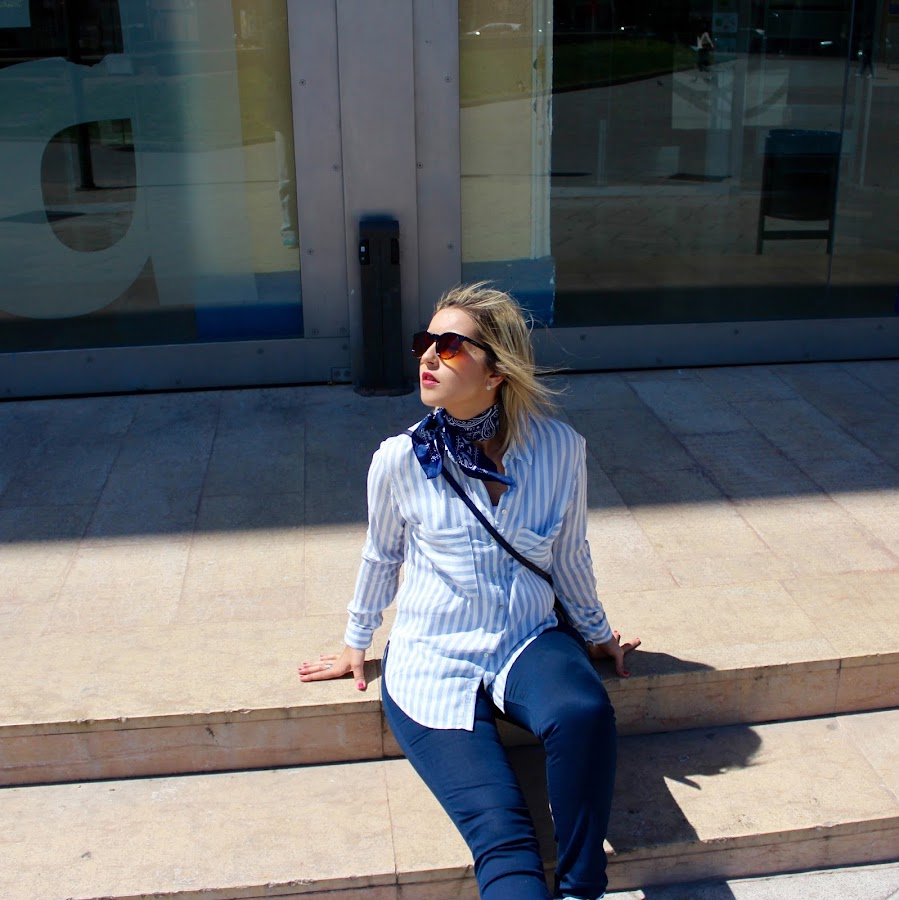 El look que os enseño hoy, es el que lleve ese día, en el que opté por un look cómodo, ya que el plan era pasear todo día. Me puse mi nueva camisa de rayas de Stradivarius y un pantalón azul y mi inseparable chaqueta militar. Los accesorios del look fueron mis Converse, un bolso en color azul y una bandana en el mismo color.