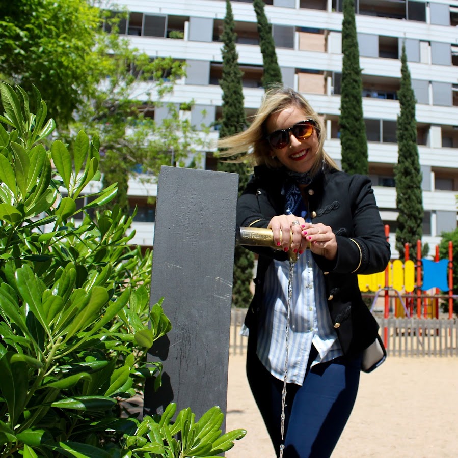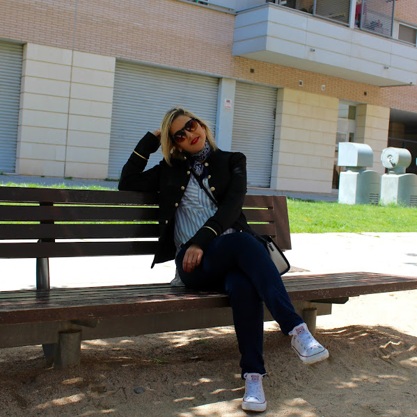 The outfit that I show you today, its the outfit that I wore that day. I decided to wear a comfy outfit because we planned to walk all the day. I wore my new shirt with stripes of Stradivarius, blue pants and my militar jacket. The accessories of the outfit were my Converse, a blue bag and a blue bandana.