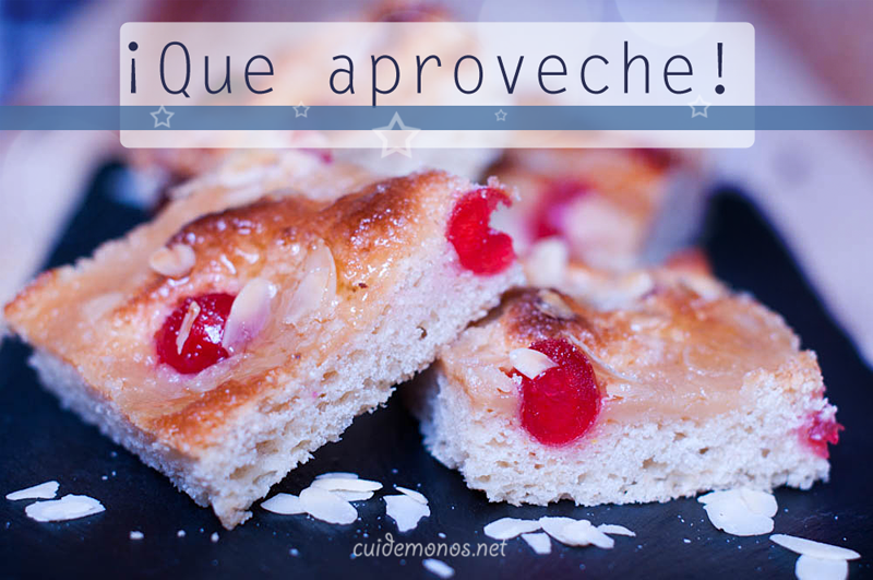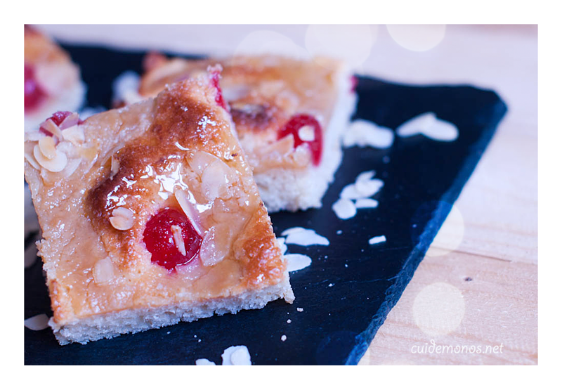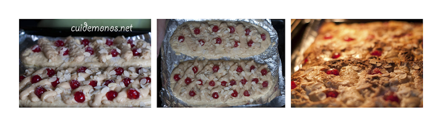 Ahora viene el momento de "decorar" nuestra coca. En este caso he elegido guindas y crema pastelera porque son lo más típico, además he añadido almendras laminadas aunque por lo general suelen usarse piñones.