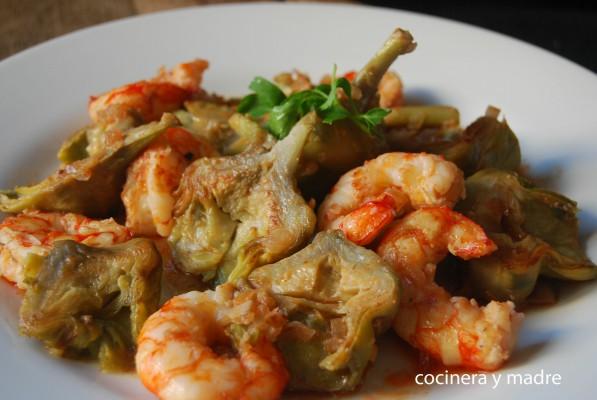 Un plato rico y saludable, unas alcachofas con langostinos que son muy fáciles de preparar, una receta casera de verduras, sin apenas grasas y de lo más fresca.
