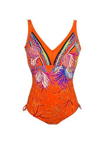 Un modelo llamativo con aros en naranja fuerte. Un bañador 2020 con aros integrados que forma parte de la familia Luxurianca, combinando el naranja chillón y un estampado en base a ramajes y escote en V delantero. El escote es muy pronunciado en la espalda, añadiendo más comodidad y sensualidad. Una propuesta en colores optimistas y alegres para ponerle energía positiva al año.Bikinis de cintura alta, estampado étnico Watercult