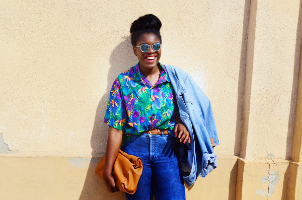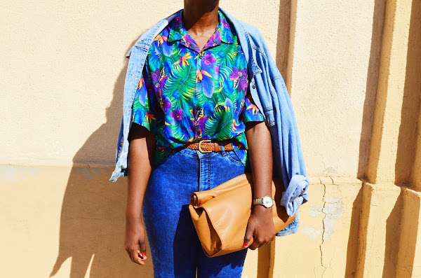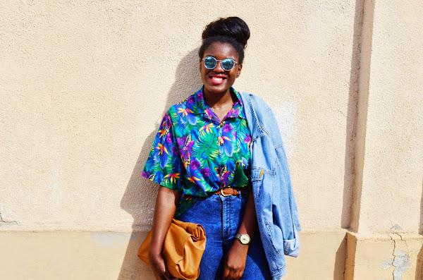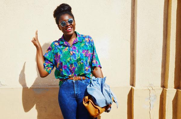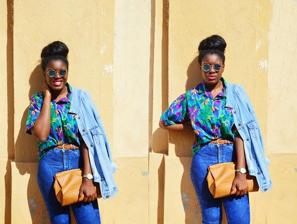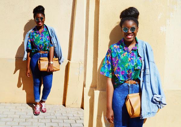 Camisa Hawaina : Flamingos Vintage Kilo Murcia / Chaqueta Denim : Vintage / Clutch : Zara (old) / Vaqueros altos : H&M (old) / Sneakers : Zatroshop / Gafas : Zara (old)