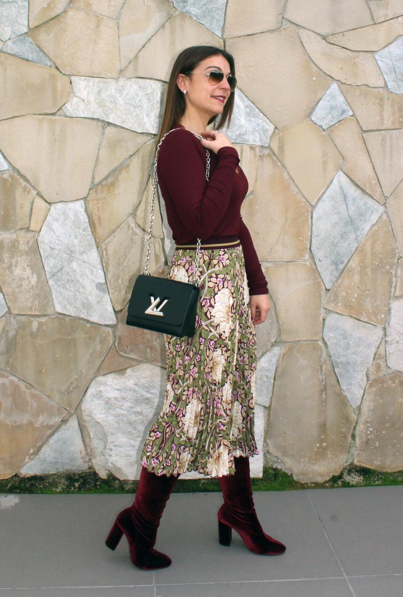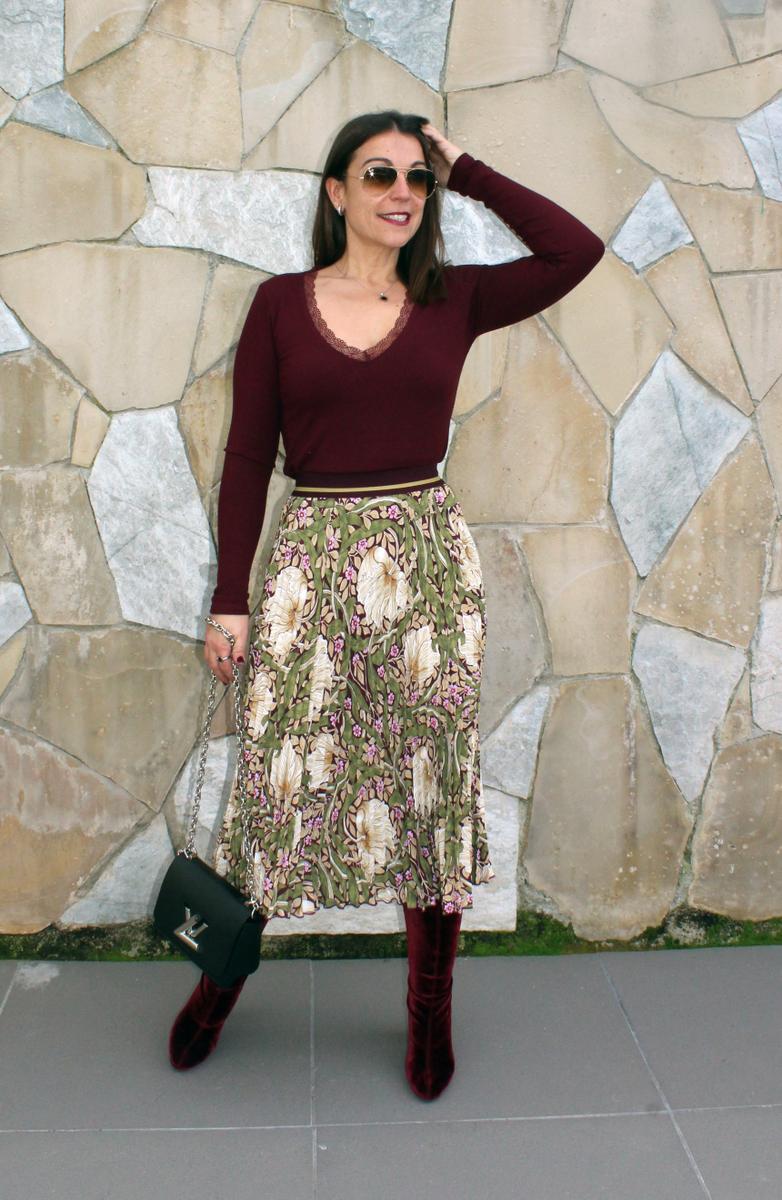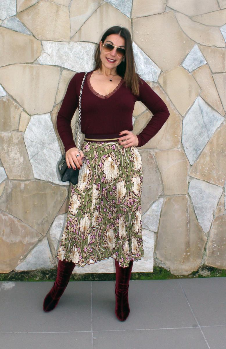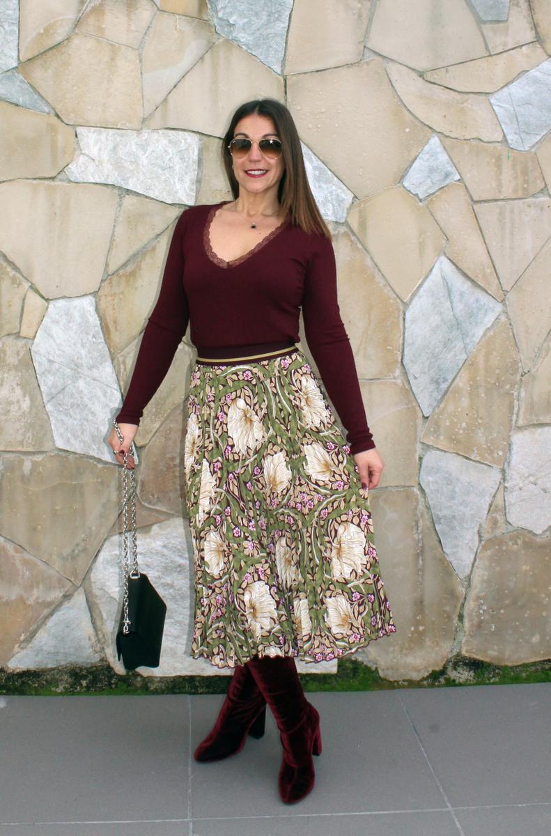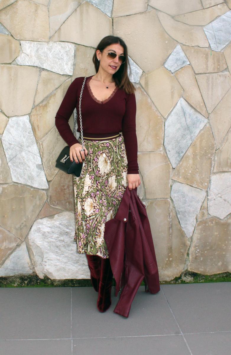 En mi look de hoy elegí una con estampado floral y goma ancha marcando cintura en tonos verdes, beige y granate. Aunque los colores la falda permite muchas combinaciones, me decanté por mi color preferido en las épocas más frías. A la vista está, botas de terciopelo, camiseta y cazadora en color granate, la verdad es que cero complicación