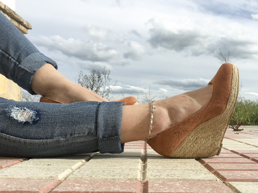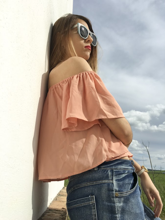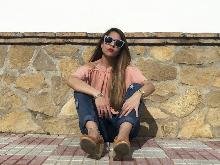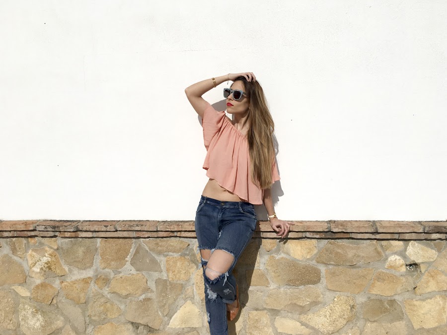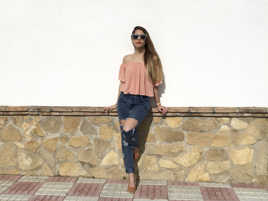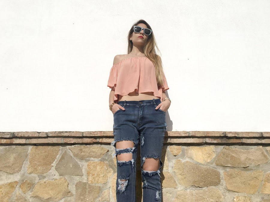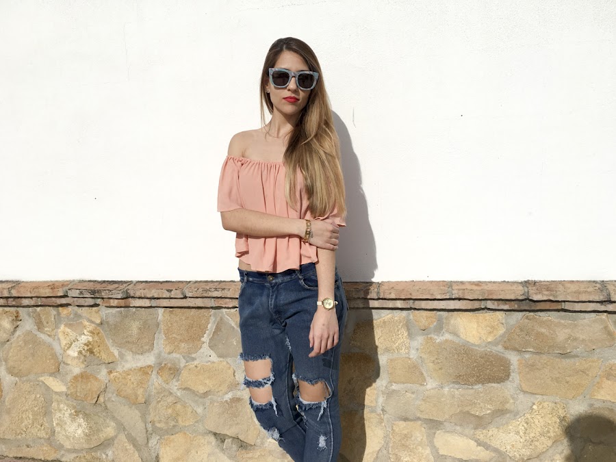 Y para el outfit he elegido un crop top de vuelo y hombros descubiertos, unos jeans rotos, cuñas de esparto y como complemento, mi pulsera de números romanos dorada.