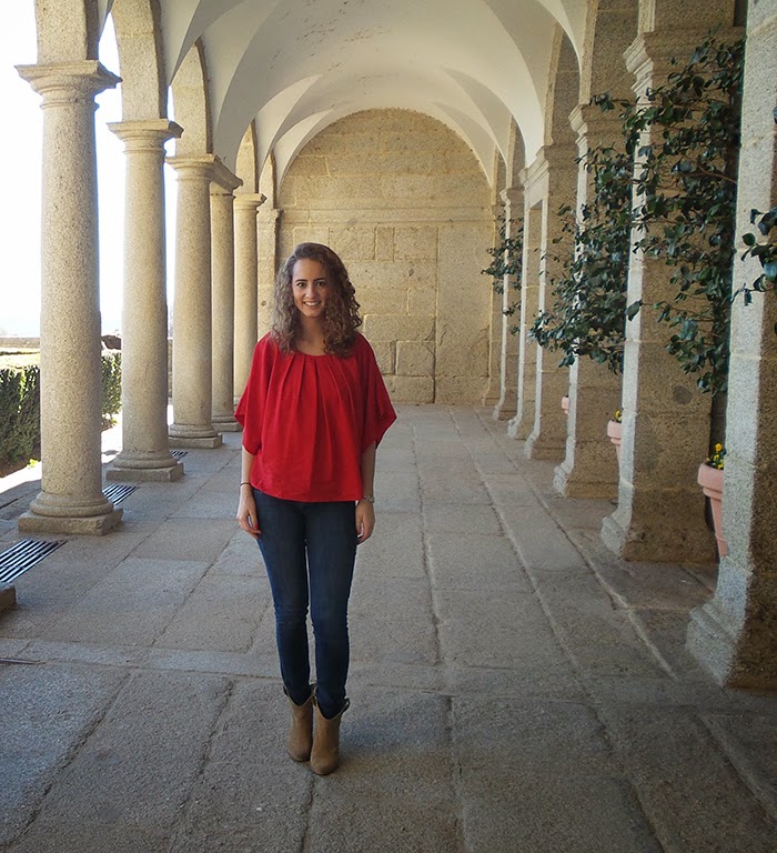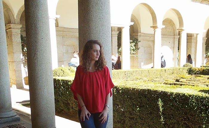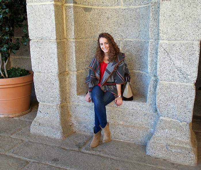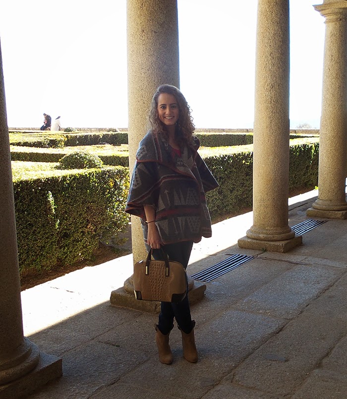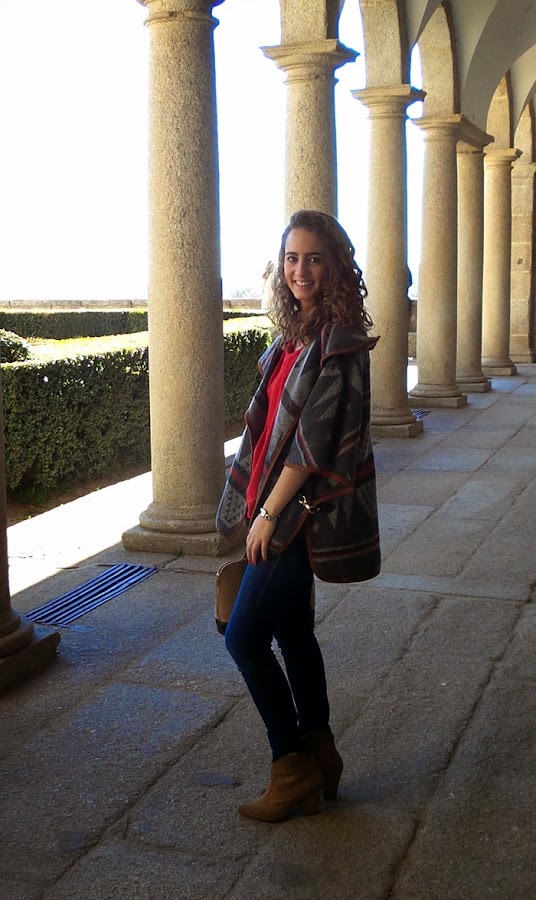 Buenos días!¿Cómo va la primera semana después de las vacaciones?Siempre es dura la vuelta pero ya no queda nada para el fin de semana, animo!Os os enseño unas fotos que hicimos durante estas vacaciones en El Escorial. Elegí un conjunto cómodo con un toque de color para acompañar el día tan bonito que hacía.La pieza clave es el poncho azteca en tonos grises y rojo.