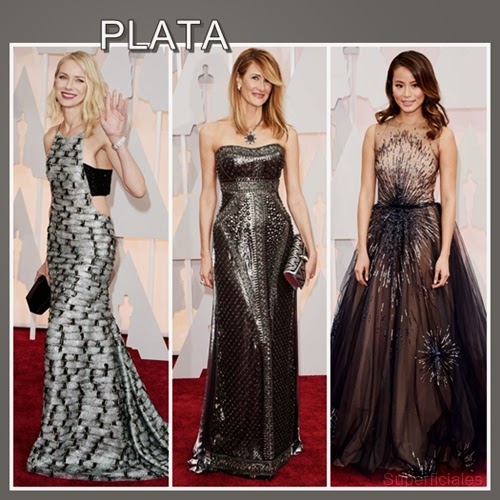 El vestido de Armani Privé que llevaba la dos veces nominada al Óscar Naomi Watts ha sido muy alabado, el de Laura Dern, lo firma Alberta Ferreti, y el tercer vestido plateado de la actriz estadounidense Jamie Chung, es de Yanine Couture.
