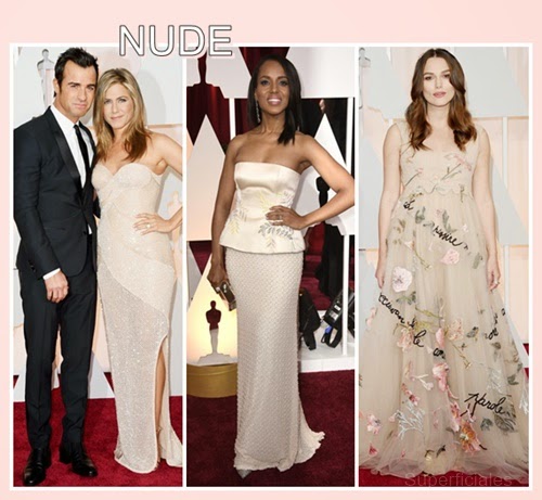 El nude es un color muy elegante para cualquier evento de estas características. Estas actrices lo escogieron, Jennifer Aniston acompañada de Justin Theroux llevaba un Versace; Kerry Washington con un elegante dos piezas de Miu Miu y una embarazada Keira Knightely con un Valentino Alta Costura.