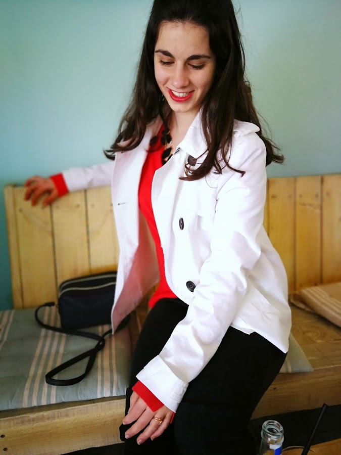 Hablando de trabajos, las fotos del look de hoy es parte de uno de ellos (deciros que éste será el primero de los tres). En cuanto al primero, fue ver el bar y saber inmediatamente que sería el lugar perfecto. Para ello, escogí un sencillo jersey rojo con botones dorados, un trench blanco y los pantalones y botas altas negras para darle un toque más cañero al conjunto.