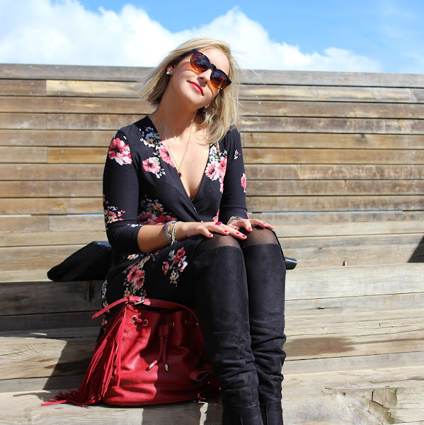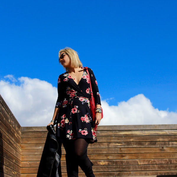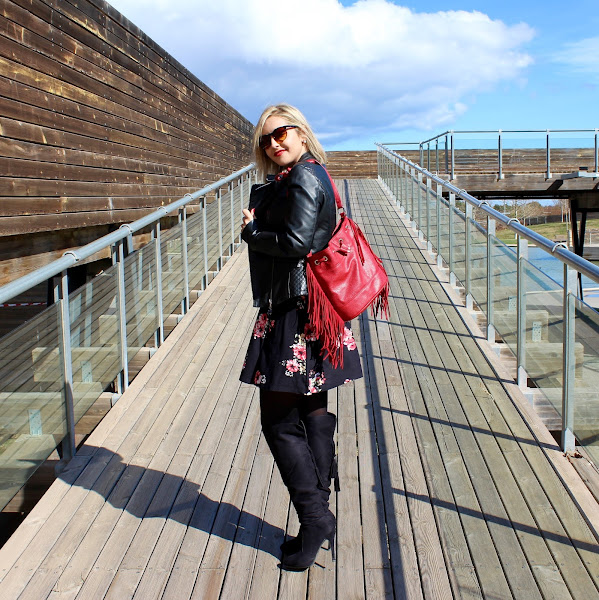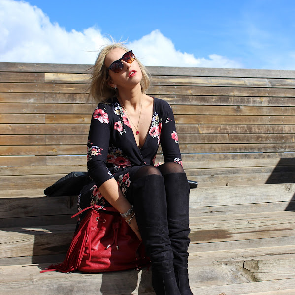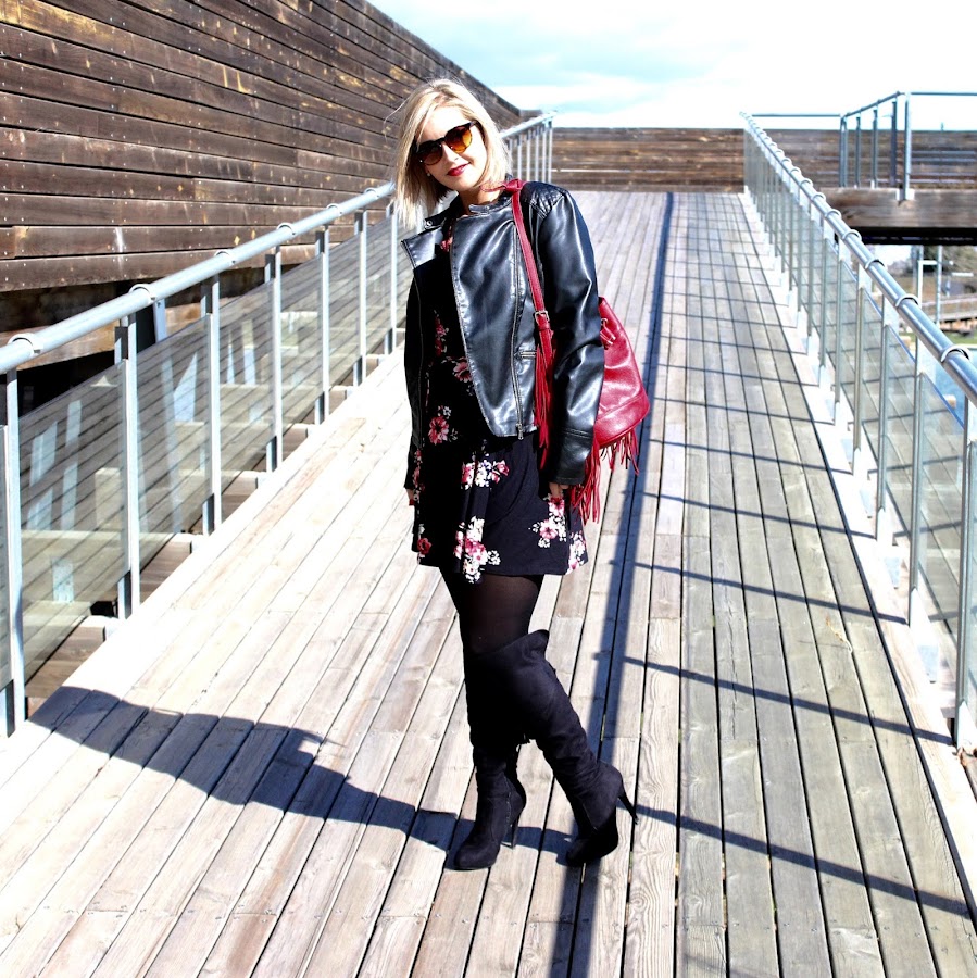 Último look del mes de febrero con un look muy sexy. Hoy os enseño el look que lleve para celebrar mi cumpleaños y me apetecía un look sexy y femenino para ir a comer con mi familia. Para la ocasión estrené mi nuevo vestido de Bershka negro con flores rojas, que creo que el escote que tiene te hace sentir super sexy y femenina. Lo combiné con mis botas por encima de la rodilla, mi biker de cuero y mi bolso de rojo con flecos.