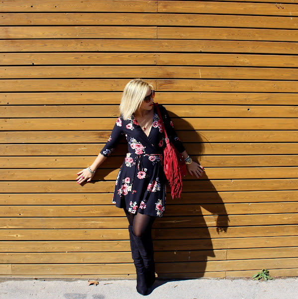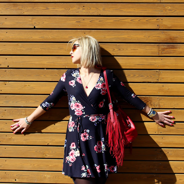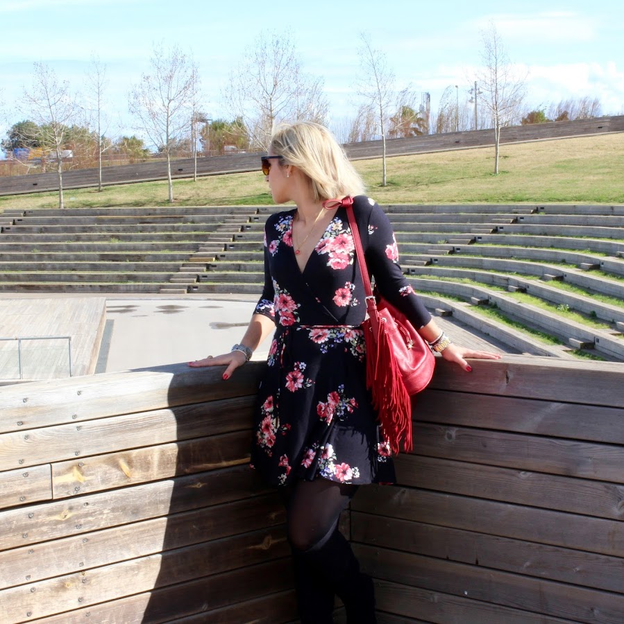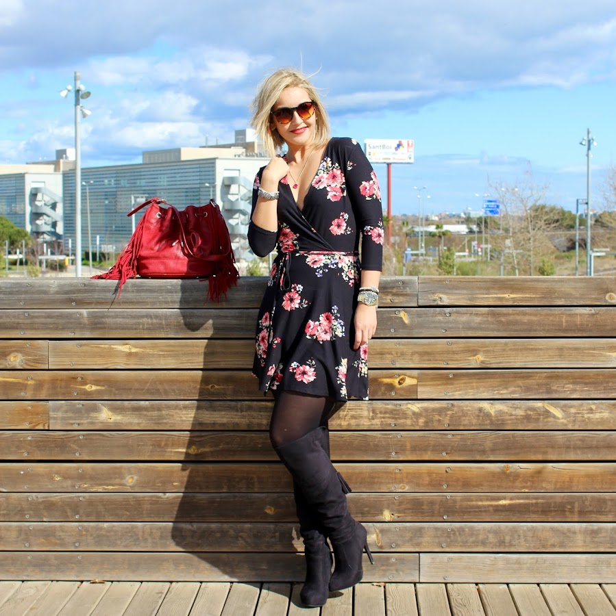 Last outfit of February with a sexy outfit. Today I show you the outfit that I wore to go to celebrate my birthday. This day I wanted to wear a feminine and sexy outfit to go to have a meal with my family. I wore my new black dress of Bershka with red flowers that I think that the kind of neckline that has the dress makes you feel very sexy and feminine. I wore it with a black boots over the knees , a black biker and my red bag with fringes.