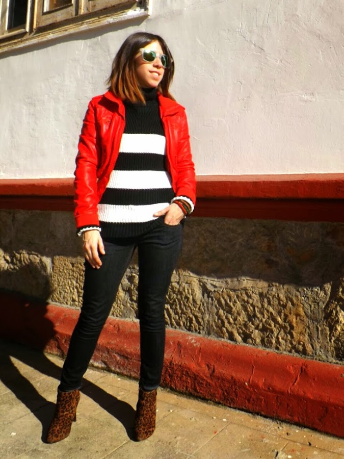 As for the look of today is quite simple. A mixture that I "m passionate about: white, black and red. The stripes jersey is a staple in any wardrobe ( I just bought it in the sales of Zara ) and combined them with my red leather jacket to give it a rock point . To break a bit with the white - black monotony , leopard booties are the perfect footwear. As accessories , I wear this funny bracelets from Bluefish , do not forget to visit their page .