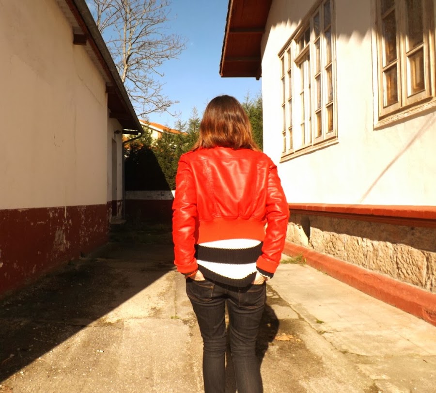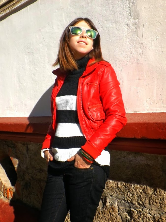 En cuanto al look de hoy, es bastante sencillo. Una mezcla que sabéis que me apasiona: blanco, negro y rojo. El jersey de rallas es un básico en cualquier armario ( éste lo acabo de comprar en las rebajas de Zara) y lo he combinado con mi cazadora roja de cuero para darle un punto macarra. Para romper un poco con la monotonía blanco-negro, unos botines de leopardo son el calzado perfecto. Como accesorios, llevo éstas pulseras tan divertidas de Bluefish, no dejéis de visitar su página.