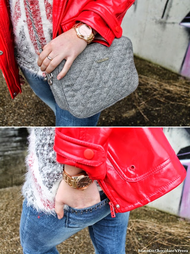 Llevo prendas conocidas como este sweater de pelito con la bandera de inglaterra, jeans claroscon detalles en los bolsillos y chuvasquero en rojo a lo caperucita roja. De complementos opté por bolso de tela gris, botas de agua rojas y collar de bolas.