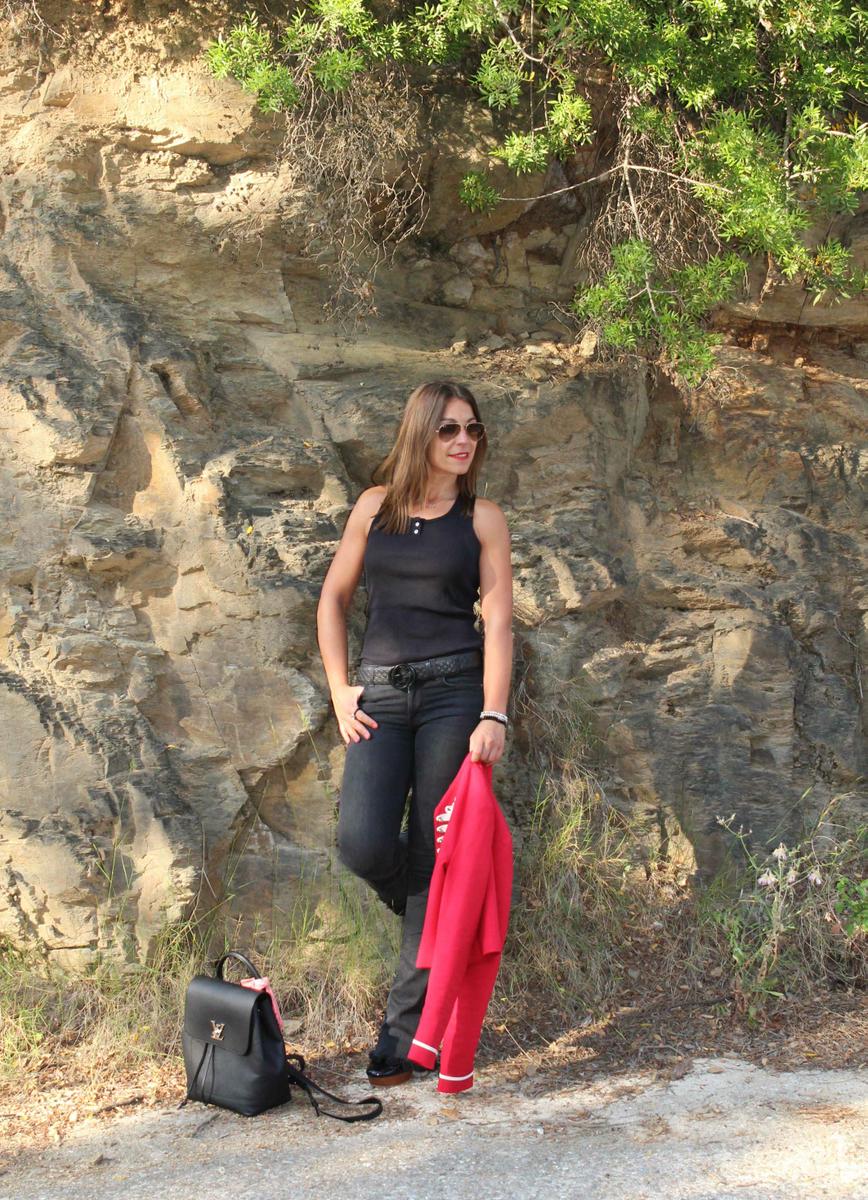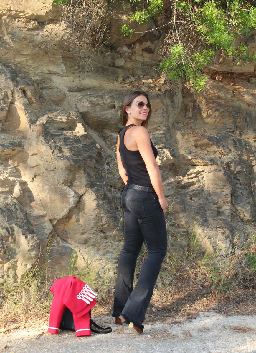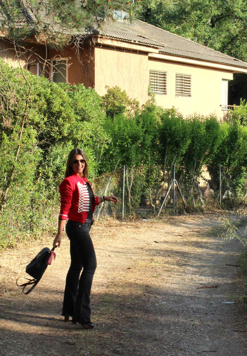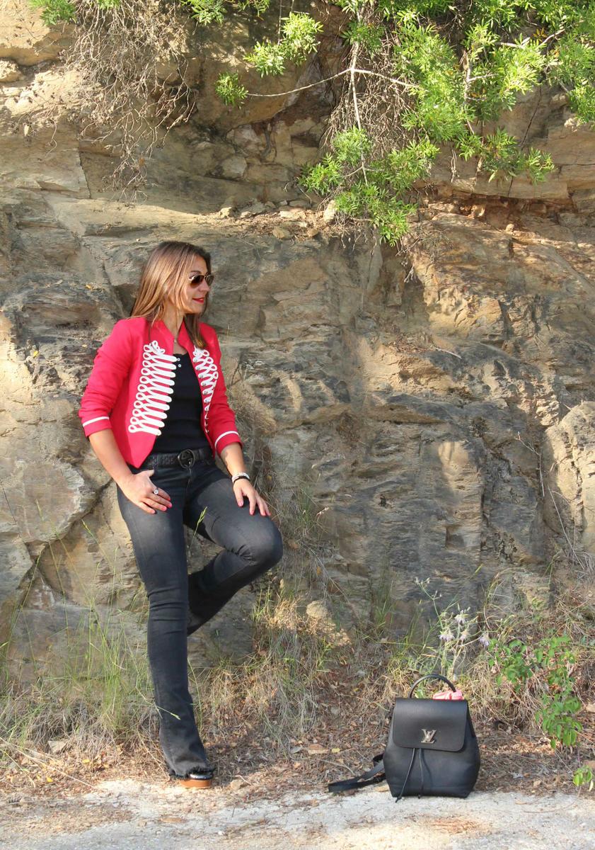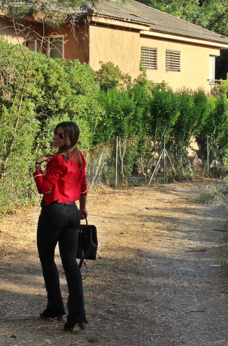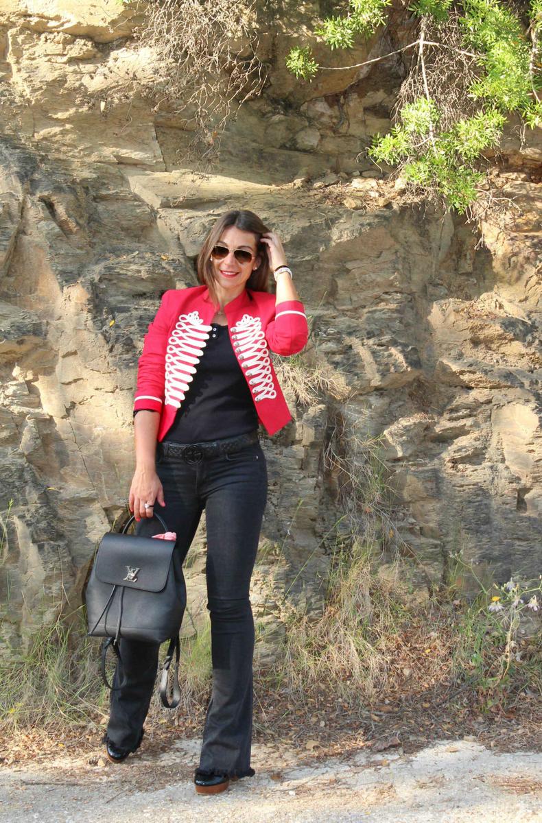 Como no podía ser de otra manera, la pieza clave del look es la chaqueta militar de color rojo. Una chaqueta con cuello mao, corte por la cintura y bonitos adornos en dorado en la pechera y a la altura de la muñeca. Como suele pasar cuando combino prendas tan llamativas, el resto del conjunto es bastante neutro. En este caso he recurrido a mis inseparables pantalones de campana ( que a la mínima que puedo los saco a pasear, pero es que son tan cómodos…) y camiseta básica con escote de nadadora en la espalda. Zapatos y complementos también en negro, el resultado un conjunto cómodo y muy práctico, actual y muy chic