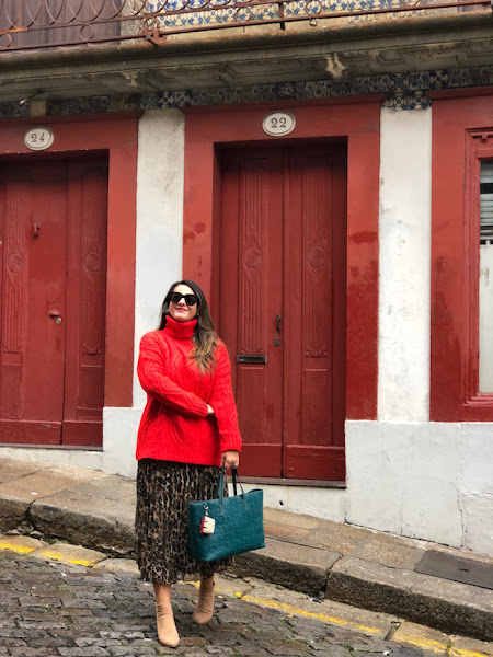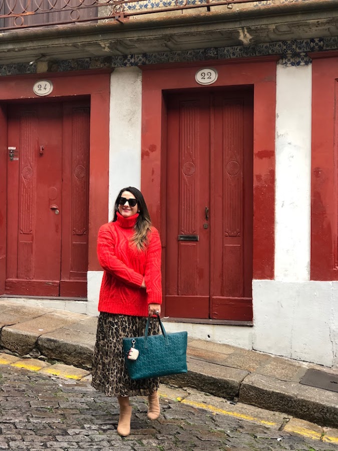 Combiné la falda plisada en gasa con print de leopardo con jersey de cuello vuelto en color rojo. El bolso, uno de mis favoritos, en color verde que da al look un toque de color que rompe la mezcla de este print, pero que ha dejado un resultado perfecto.